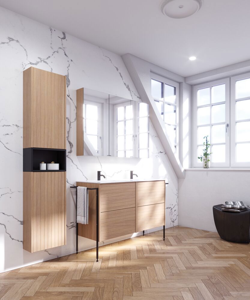 Setzen Sie auf einen minimalistischen Look? Dann wählen Sie einen Oberschrank mit glatten Fronten und Push-open-Funktion. Wenn Sie mehr Wärme und Gemütlichkeit wünschen, können Sie einen Schrank mit Holzmaserung oder Griffen wählen, die zu Ihrem persönlichen Stil passen. Welchen Stil Sie auch immer bevorzugen, die meisten unserer Oberschränke lassen sich mit optionalen Farben und Materialien individuell gestalten und werden so zu einem natürlichen Teil Ihres Traumbades.