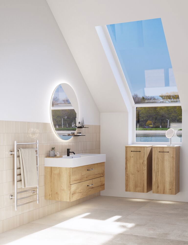 Wenn Sie in Ihrem Badezimmer eine schräge Wand haben, ist ein Waschtischunterschrank in Kombination mit einem Unterschrank eine tolle Idee. Mit einem asymmetrischen Waschbecken können Sie die Unterschränke unter Ihrer schrägen Wand und den Waschtischunterschrank mit dem Waschbecken weiter im Raum stehen lassen. Auf diese Weise können Sie alle Quadratmeter im Bad ausnutzen und erhalten auch bei begrenztem Platzangebot Stauraum. Lesen Sie hier mehr über Bäder und schräge Wände.