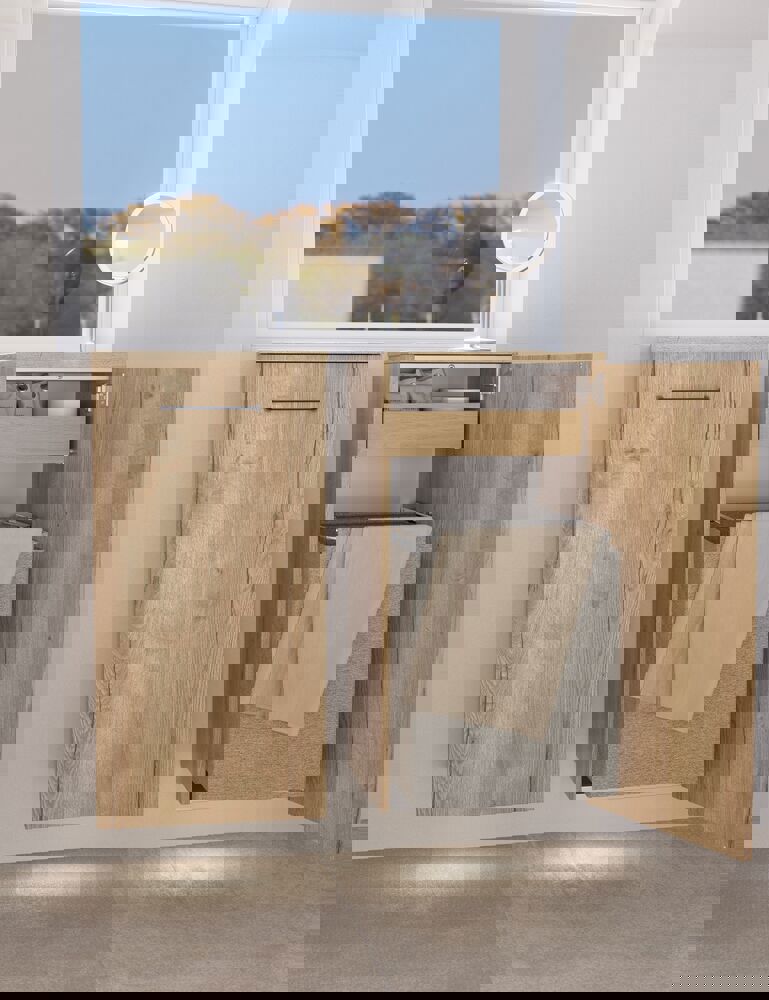 Bitte beachten Sie, dass unsere Unterschränke nicht für die Unterbringung einer Waschmaschine oder eines Wäschetrockners geeignet sind. Stattdessen können Sie mehrere Unterschränke neben der Waschmaschine platzieren, um Platz für Ihre Reinigungs- und Waschmittel zu haben.