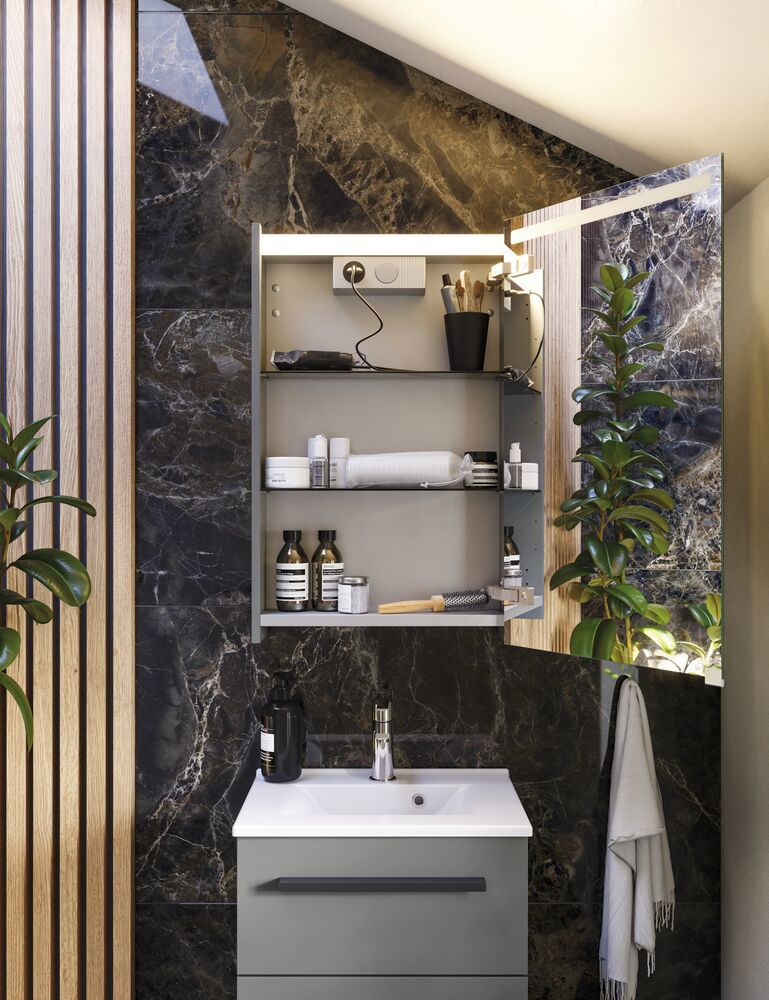 Bei der Wahl eines Spiegelschranks mit Licht ist es wichtig, den Standort der Steckdose zu berücksichtigen. Viele der Spiegelschränke von Dansani verfügen über integrierte Steckdosen, so dass Sie Ihre Elektrogeräte ohne sichtbare Kabel direkt im Schrank aufladen können.