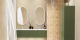Ein runder Spiegel verleiht dem Badezimmer eine weiche und organische Ausstrahlung. Ein runder Spiegel kann eine entspannte und verspielte Atmosphäre schaffen und scharfe Linien und Ecken im Raum auflockern.