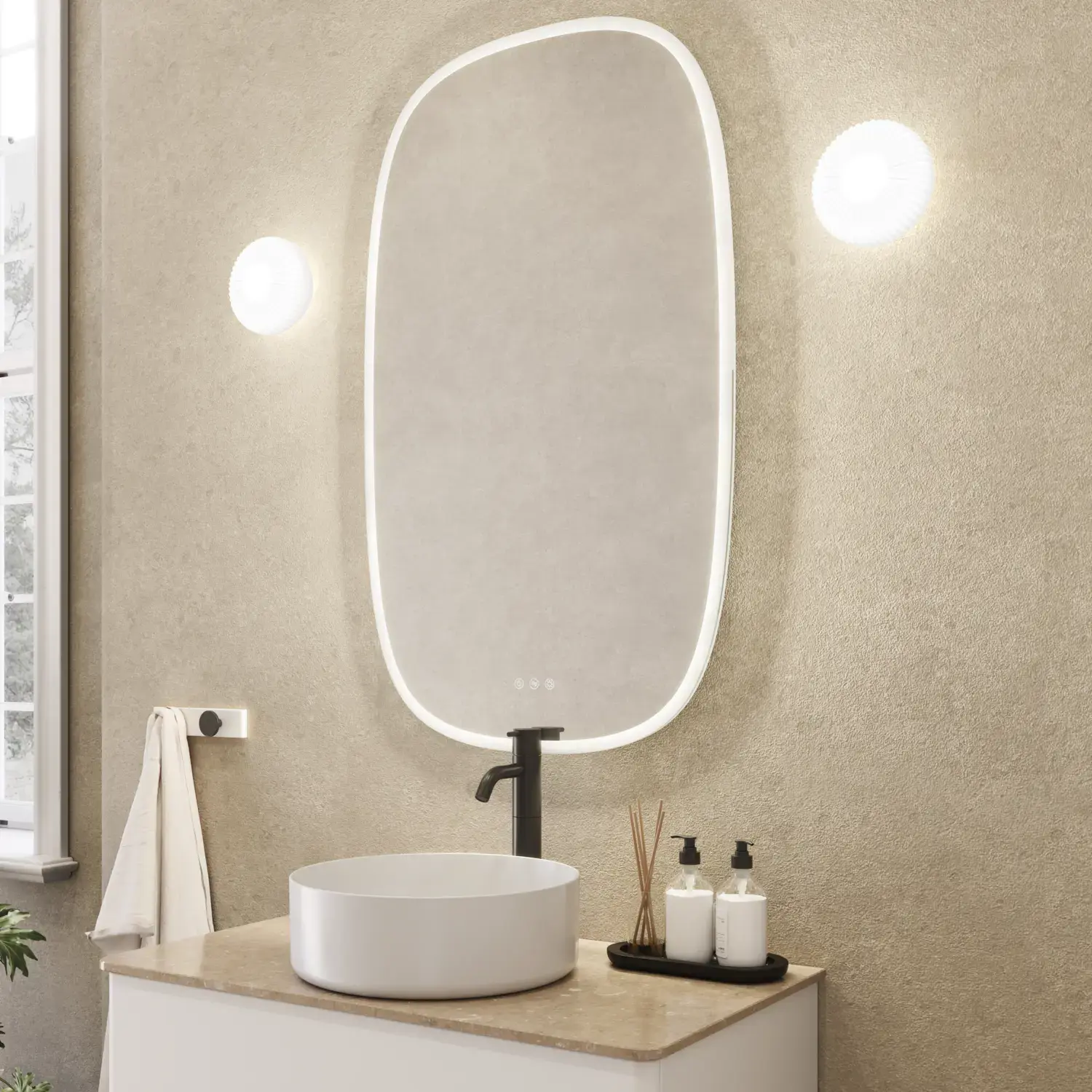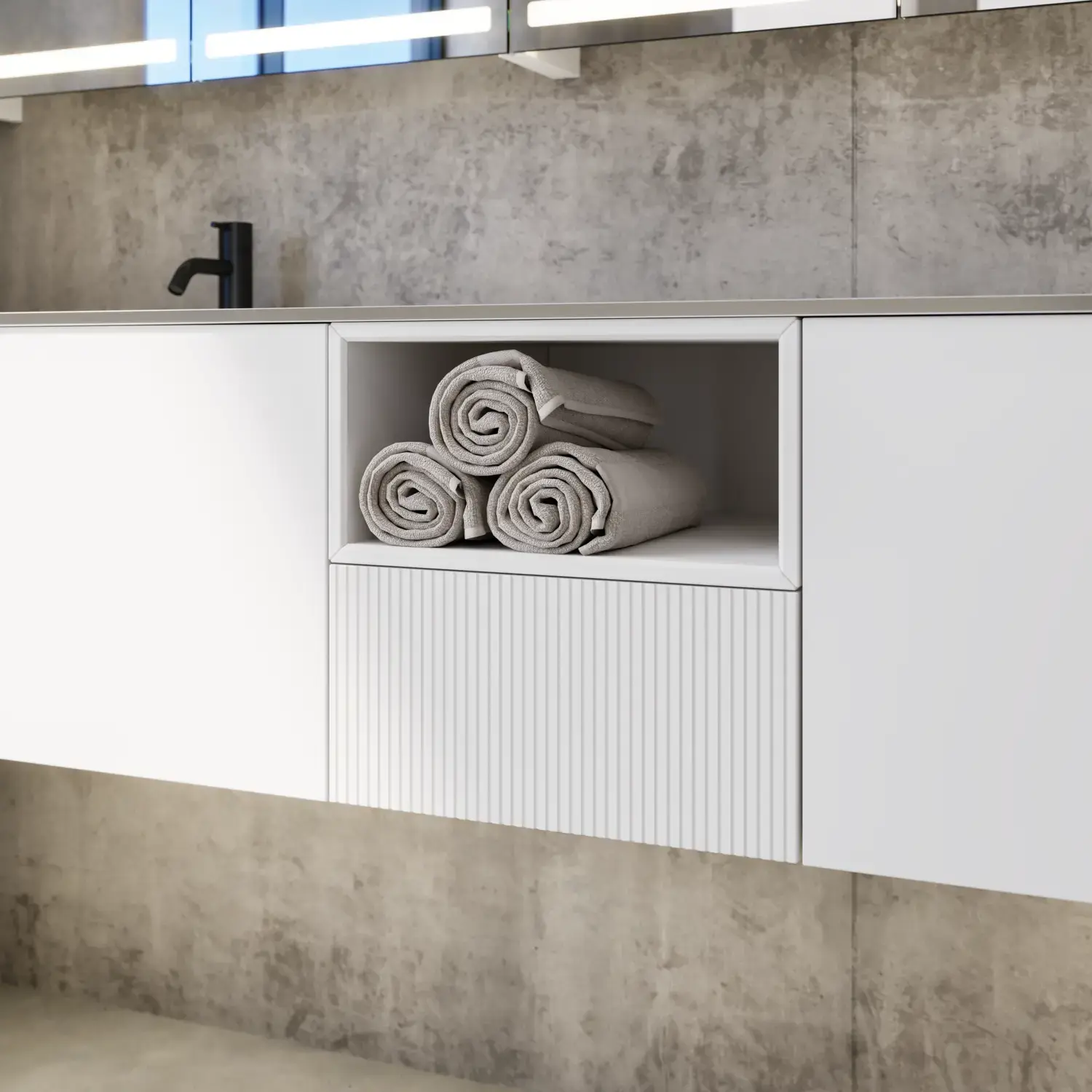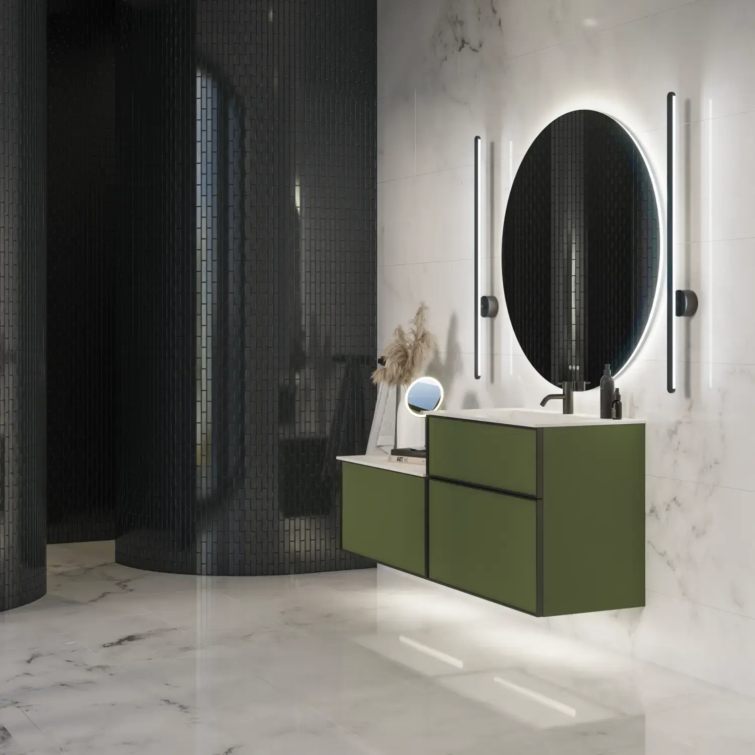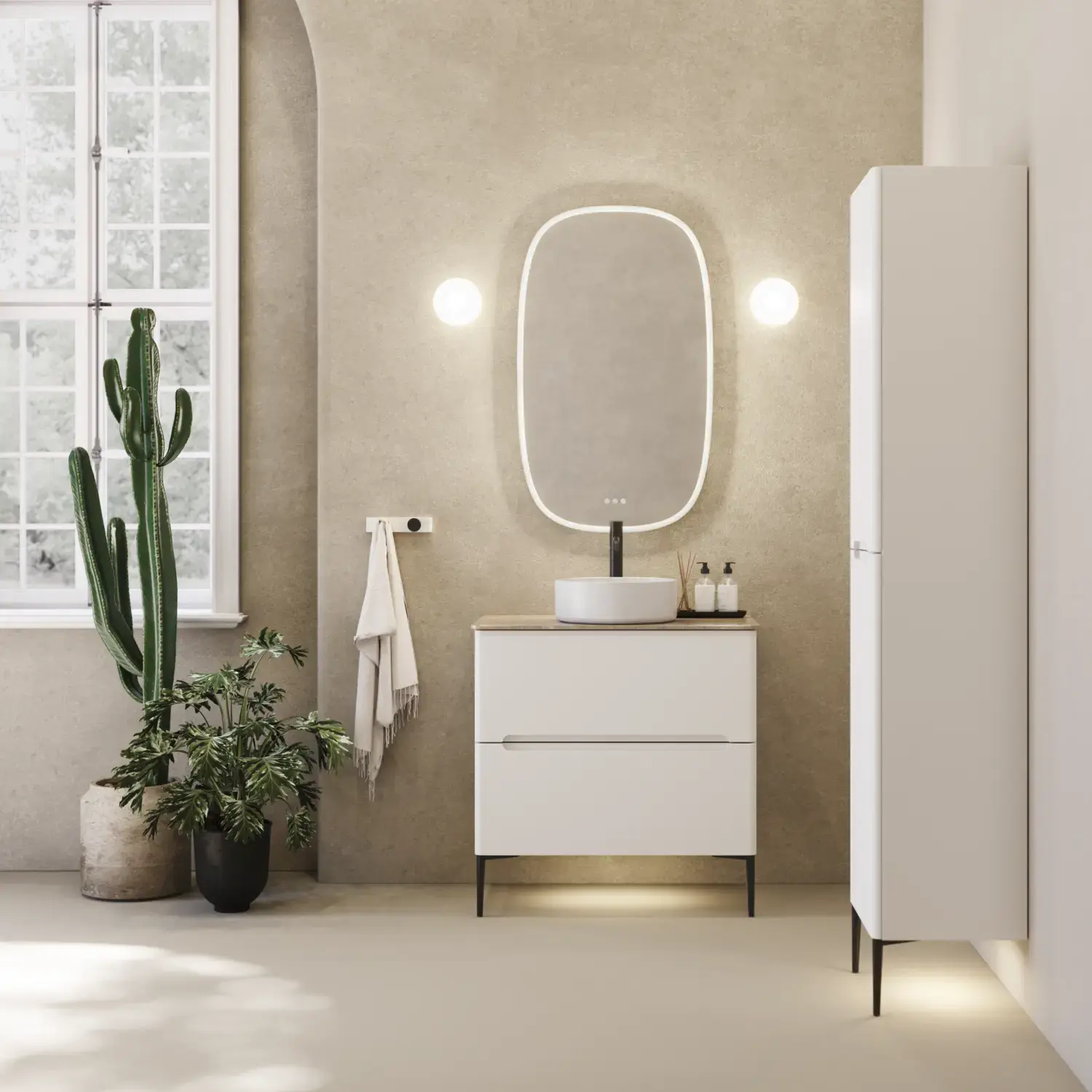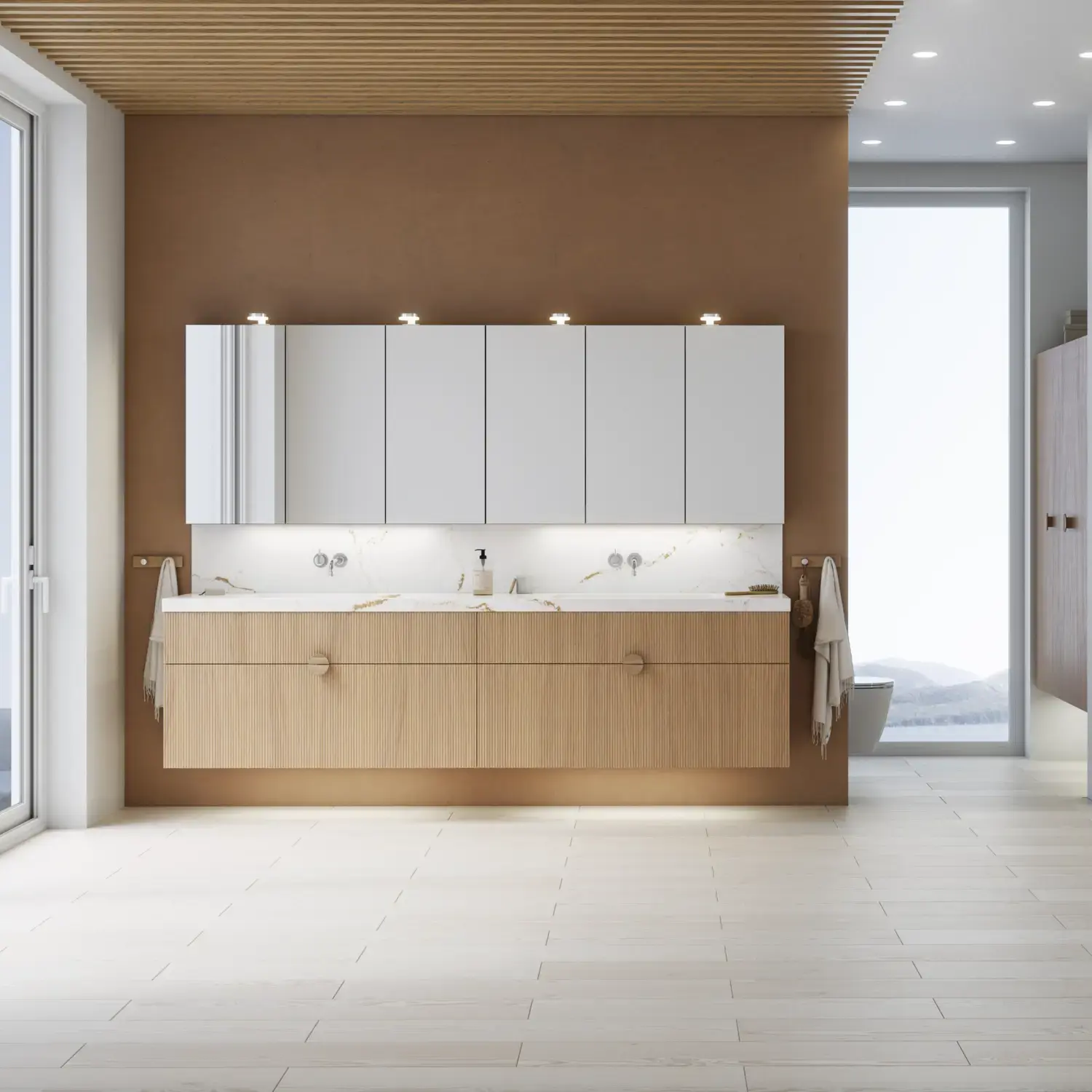 Neben weichen Formen zeigt sich 2026 auch ein klarer Gegentrend: reduzierte Linienführung und ein stärker architektonischer Ausdruck – insbesondere bei der Beleuchtung. Längliche Leuchten am Spiegel sorgen für eine klare, professionelle Optik und erleichtern zugleich die Schaffung von funktionalem und angenehmem Licht im Alltag. Auch die Steuerung von Helligkeit und Farbtemperatur gewinnt an Bedeutung, da Licht maßgeblich die Atmosphäre beeinflusst.