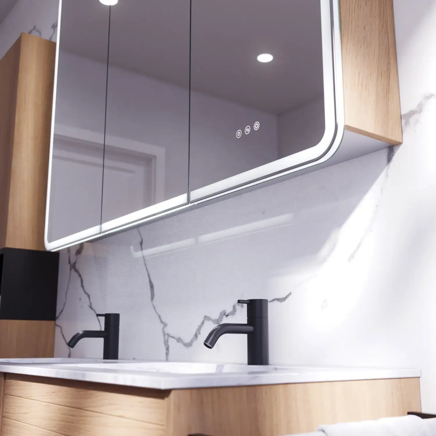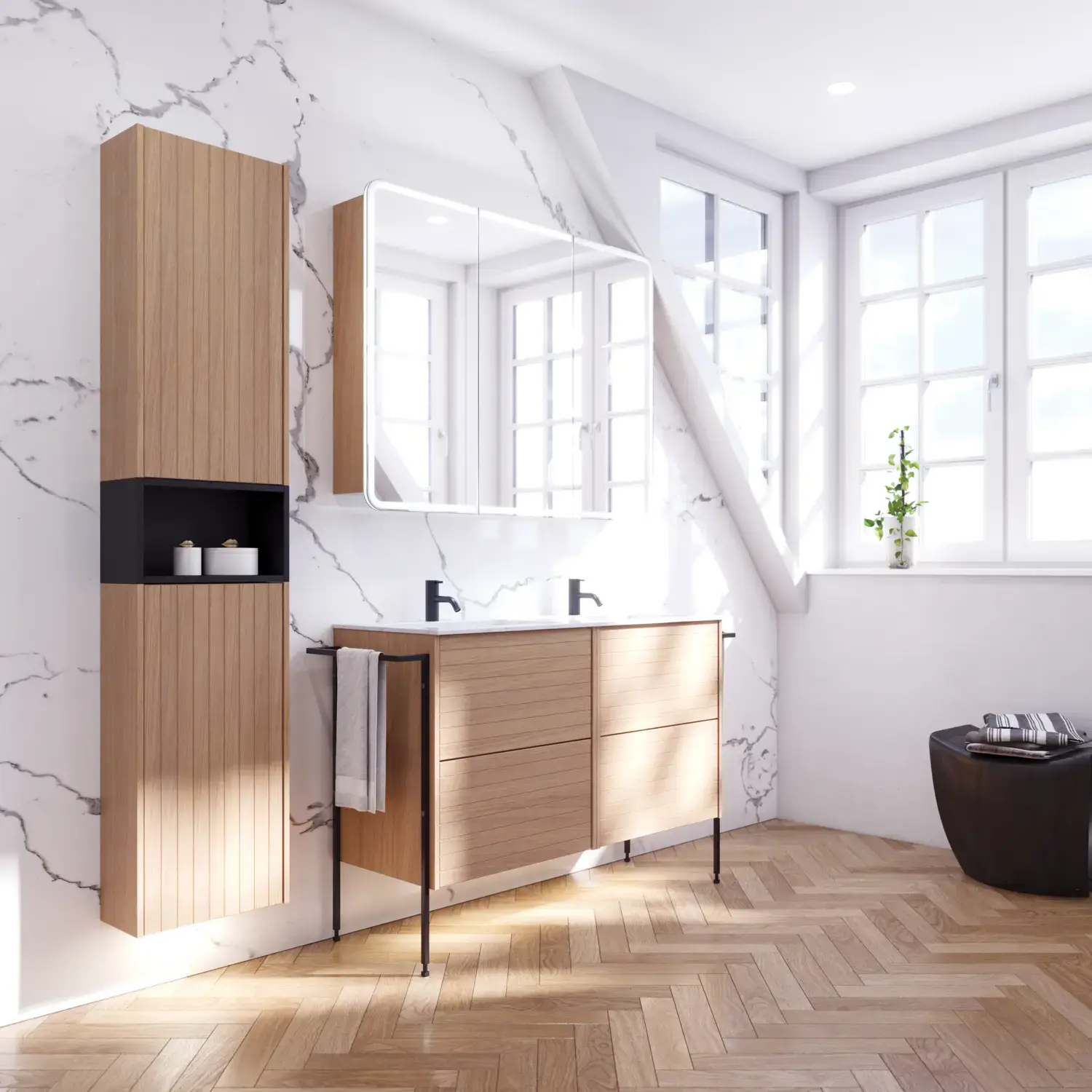 Ein weiteres Beispiel für diesen Trend sind die Spiegelschränke Gloriance und Radience. Die abgerundeten Ecken verleihen ihnen eine weiche, freundliche Ausstrahlung – weit entfernt von klassischen, eckigen Spiegelschränken. Die Form wird durch integriertes Licht innen und außen unterstrichen, sodass Sie stets ein angenehmes Lichterlebnis haben – ob die Türen geöffnet oder geschlossen sind. Die umlaufende Beleuchtung sorgt für direktes Licht auf dem Waschtisch und verbessert so die Lichtverhältnisse im Alltag. Gleichzeitig trägt sie zur allgemeinen Raumbeleuchtung bei und reduziert Kontraste, sodass mehr Licht möglich ist, ohne zu blenden – ein klarer Vorteil, besonders mit zunehmendem Alter.