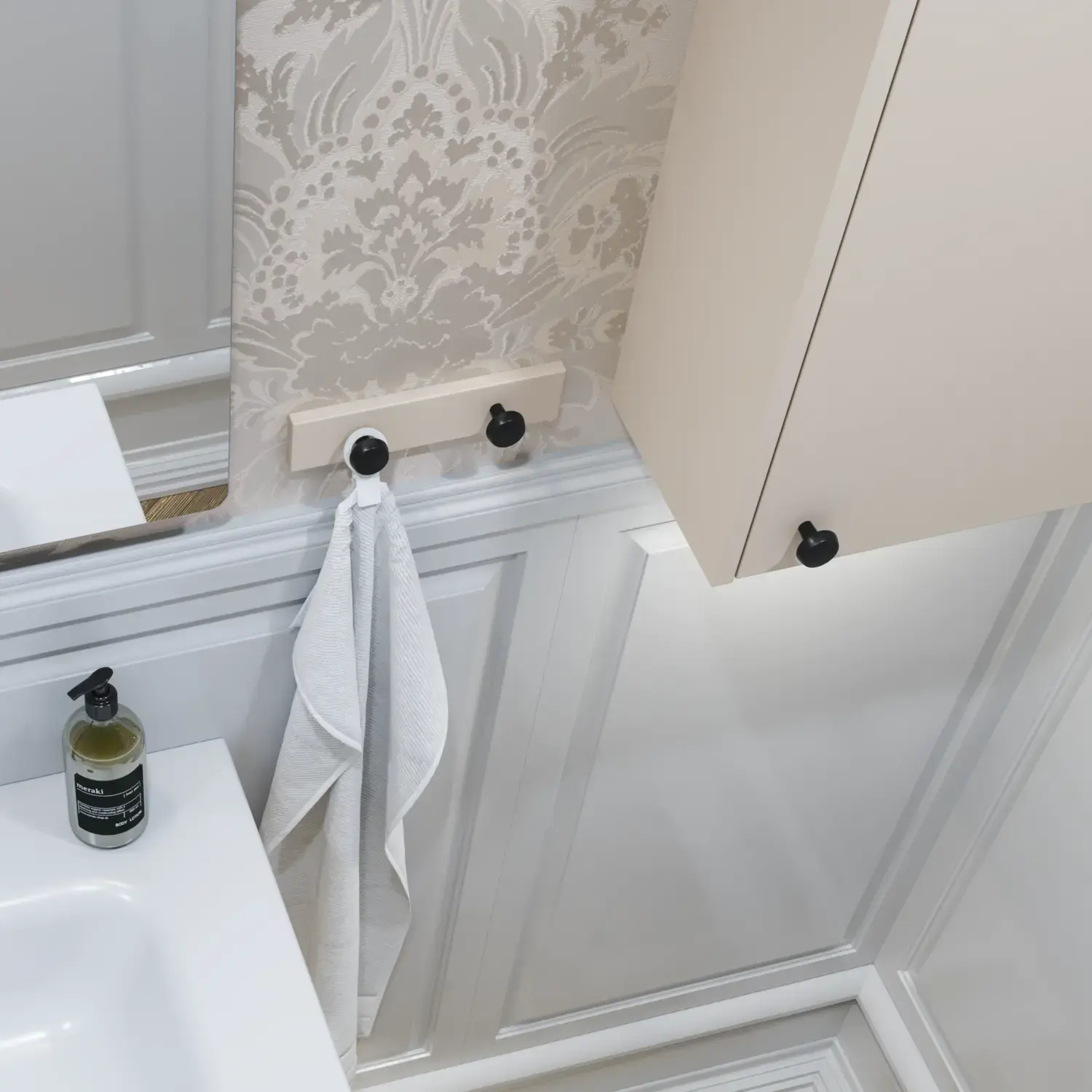 Die Knopfgriffe lassen sich zudem mit kleinen offenen Modulen oder Regalen kombinieren, die individuell dekoriert werden können – etwa mit Handtüchern, Körben oder persönlichen Accessoires. In der Serie Calidris sind die Knöpfe auch in Furnier erhältlich und unterstreichen so die natürliche und exklusive Optik.