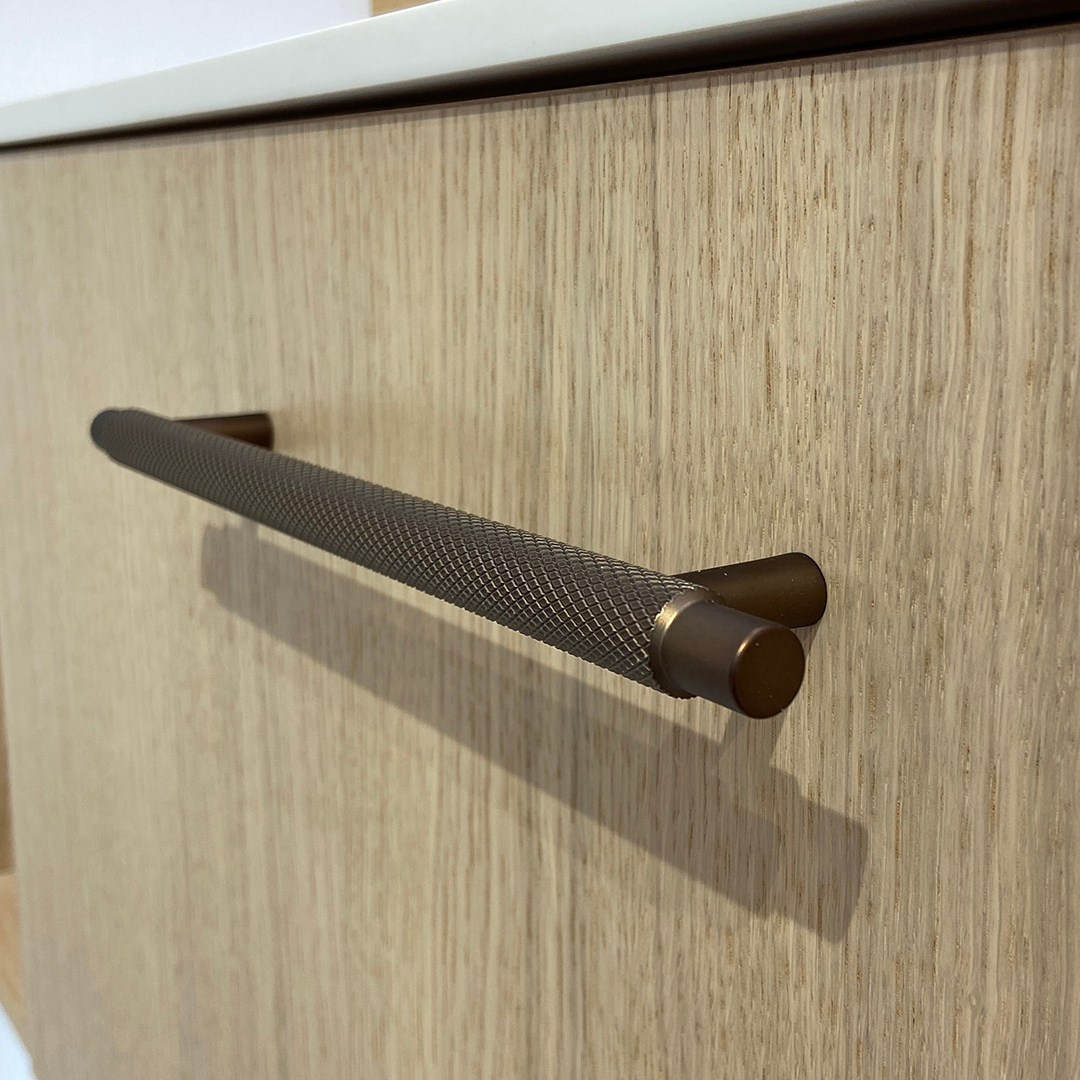 Im Trend liegen besonders matte, zurückhaltende Oberflächen mit angenehmer Haptik. Metallgriffe in Kupfer-, Bronze- oder Messingtönen bringen Wärme und Eleganz ins Bad, während Holzgriffe eine natürliche, ruhige Ausstrahlung schaffen – ideal im Zusammenspiel mit Materialien mit Charakter.