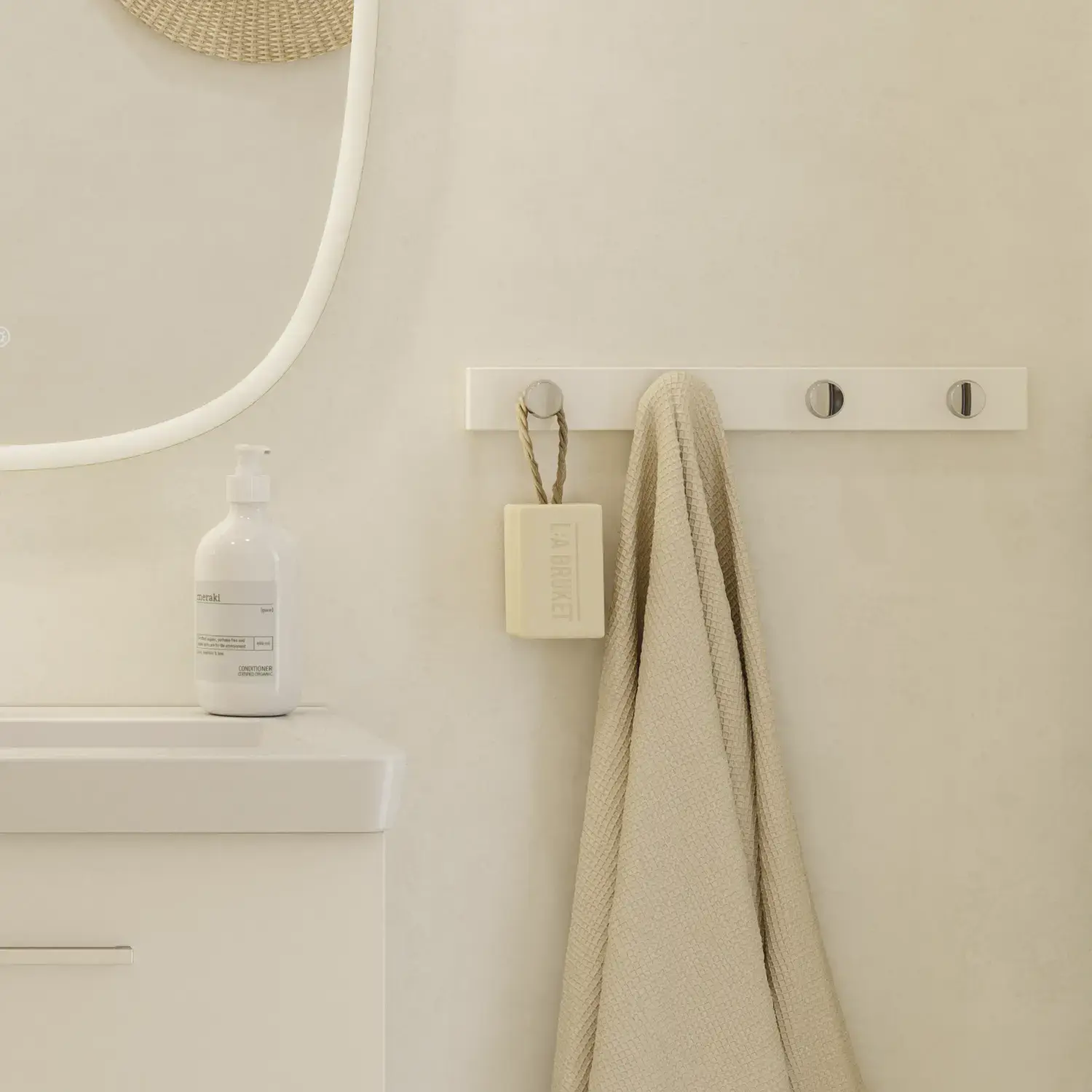 Eine naheliegende Möglichkeit, diesen Trend umzusetzen, ist unsere Hakenleiste mit frei wählbaren Knopfgriffen, bei der dieselben Griffe auch als Haken dienen können. So entsteht eine klare Verbindung zwischen Möbeln, Wänden und Funktionen – für ein ruhiges, durchgängiges Gesamtbild.