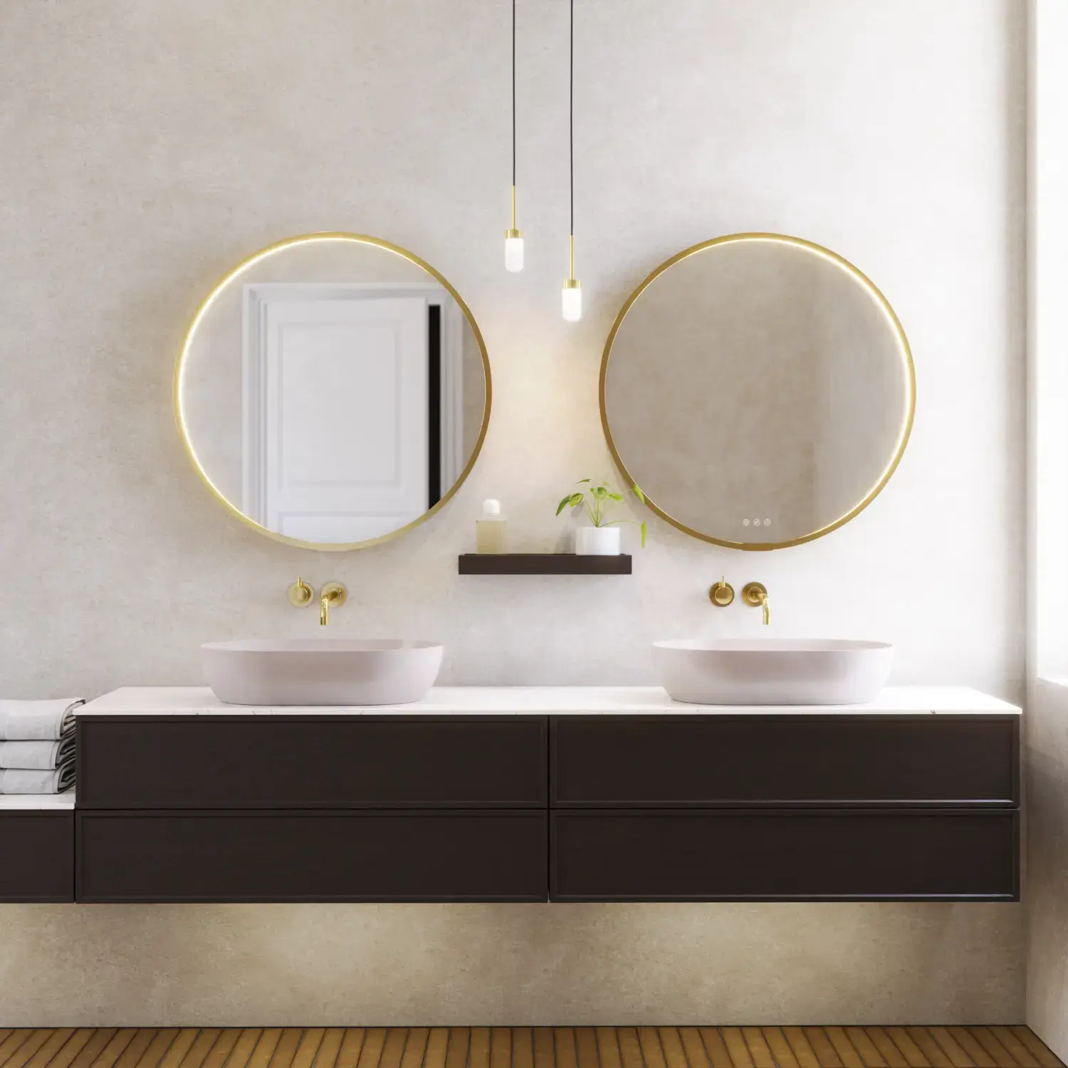 Deshalb bieten wir unseren beliebten Corona-Spiegel jetzt auch in einer größeren Ausführung an. Mit einem Durchmesser von Ø105 cm wird der runde Spiegel zu einem markanten Element im Raum und verleiht dem Bad Ruhe, Licht und ein Gefühl von Luxus.