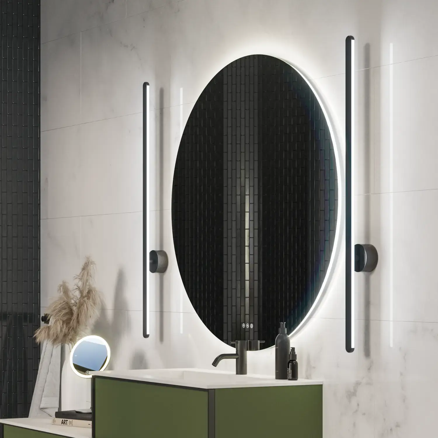 Beim Zubettgehen soll der Mensch nicht durch zu helles Licht gestört werden. Stattdessen ist es ideal mit einer warmen,gedämpften Badezimmerbeleuchtung den Tag zu beenden, ganz so wie das warme rötliche Licht bei einem Sonnenuntergang. Am Morgen dagegen benötigen Sie gutes Arbeitslicht, das etwas weißer und heller ist und an das natürliche Morgenlicht erinnert. Beides erhalten Sie, wenn Sie sich für einen Spiegel oder Spiegelschrank mit Lichtregelung entscheiden. Die Bandbreite reicht von warmem, rötlichem Licht bis hin zu kühlem, weißem Licht, und natürlich können Sie beide auf Wunsch dimmen. Und wie schon erwähnt: Kombinieren Sie Ihr Licht im Spiegel mit Ihren Deckenlampen, Aufsatzlampen etc. so dass alles zusammen, mit nur einem Touch am Lichtpanel des Spiegels oder mit unserer Fernbedienung gleichzeitig gesteuert wird.