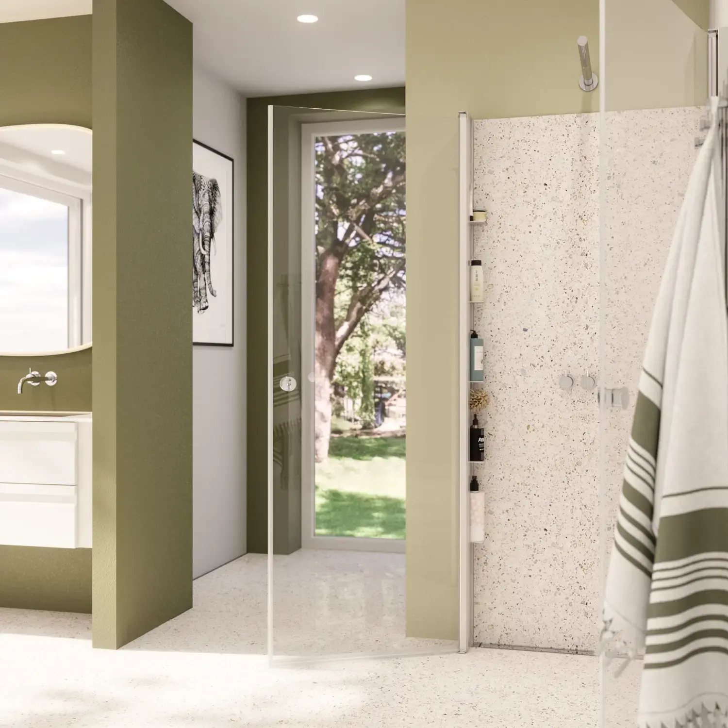 Mit Duschtüren aus Klarglas verschmilzt die Duschabtrennung auf ansprechende Weise mit dem übrigen Badezimmer, da der Eindruck von Transparenz erzeugt wird.