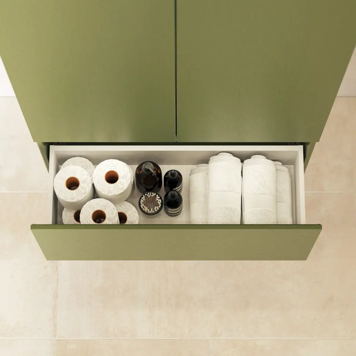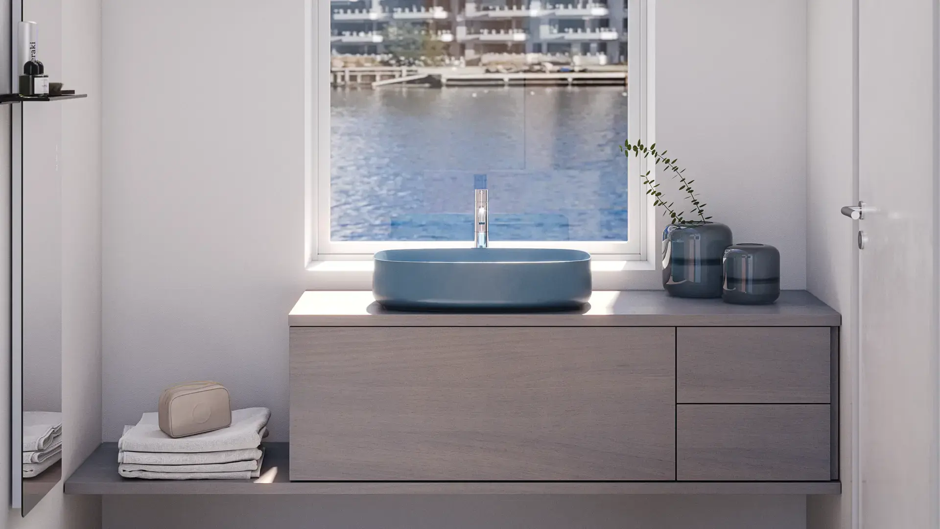 Tischplatten, Waschtischunterschränke, Schubladen, Schubladenfronten, Aufbewahrungsschränke, Schranktüren, Spiegelschränke, Oberschränke, Ablagen, Türen, Hochschränke, Griffe, Stützbeine, Scharniere, Dämpfer und Schubladenschienen.