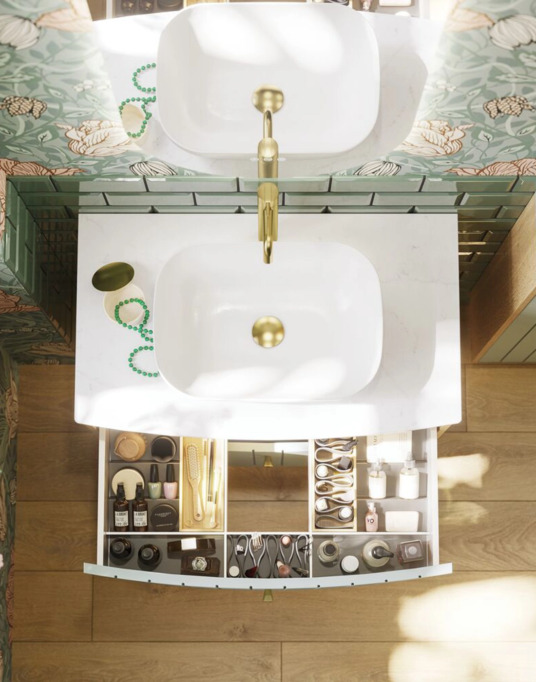Behalten Sie den Überblick über all Ihre Badutensilien mit diesem eleganten und durchdachten Einrichtungspaket, das für eine optimale Aufbewahrung in Ihrem Waschtischunterschrank sorgt. Das Paket besteht aus edlen Holzkassetten, die Ihrem Badezimmer einen stilvollen Touch verleihen und gleichzeitig die Produkte in Ihrem Waschtischunterschrank ordnen. Sie erhalten außerdem ein praktisches Schubladendisplay mit abgeschrägten Einlegeböden, die Ihre Produkte besser sichtbar und leichter zugänglich machen. Im Lieferumfang enthalten ist auch ein flexibler Raumteiler, der sowohl in den Fächer als auch in den Ablagen verwendet werden kann, um kleine Gegenstände zu ordnen. Je nach Breite Ihres Waschtischunterschranks müssen Sie 1 oder 2 Packungen kaufen, um die gesamte Schublade zu füllen.