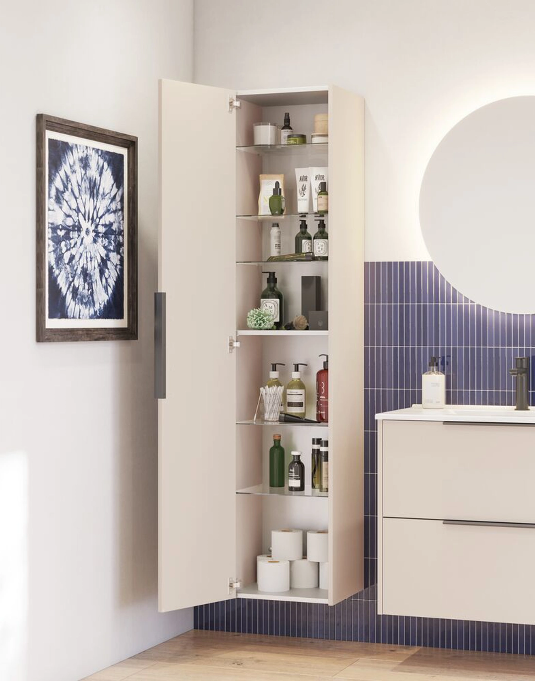 Dieser Hochschrank ist auf Flexibilität und Geräumigkeit ausgelegt. Mit einer reversibler Tür können Sie den Schrank an Ihre Inneneinrichtung anpassen, egal welche Richtung Sie bevorzugen. Im Inneren finden Sie ein stabiles Holzablage und 4 herausnehmbare Glasablagen, die Ihnen viele Aufbewahrungsmöglichkeiten bieten. Der Schrank ist in Weiß, Sand oder Hellblau erhältlich. Der Griff ist bereits angebracht, so dass der Schrank sofort einsatzbereit ist.