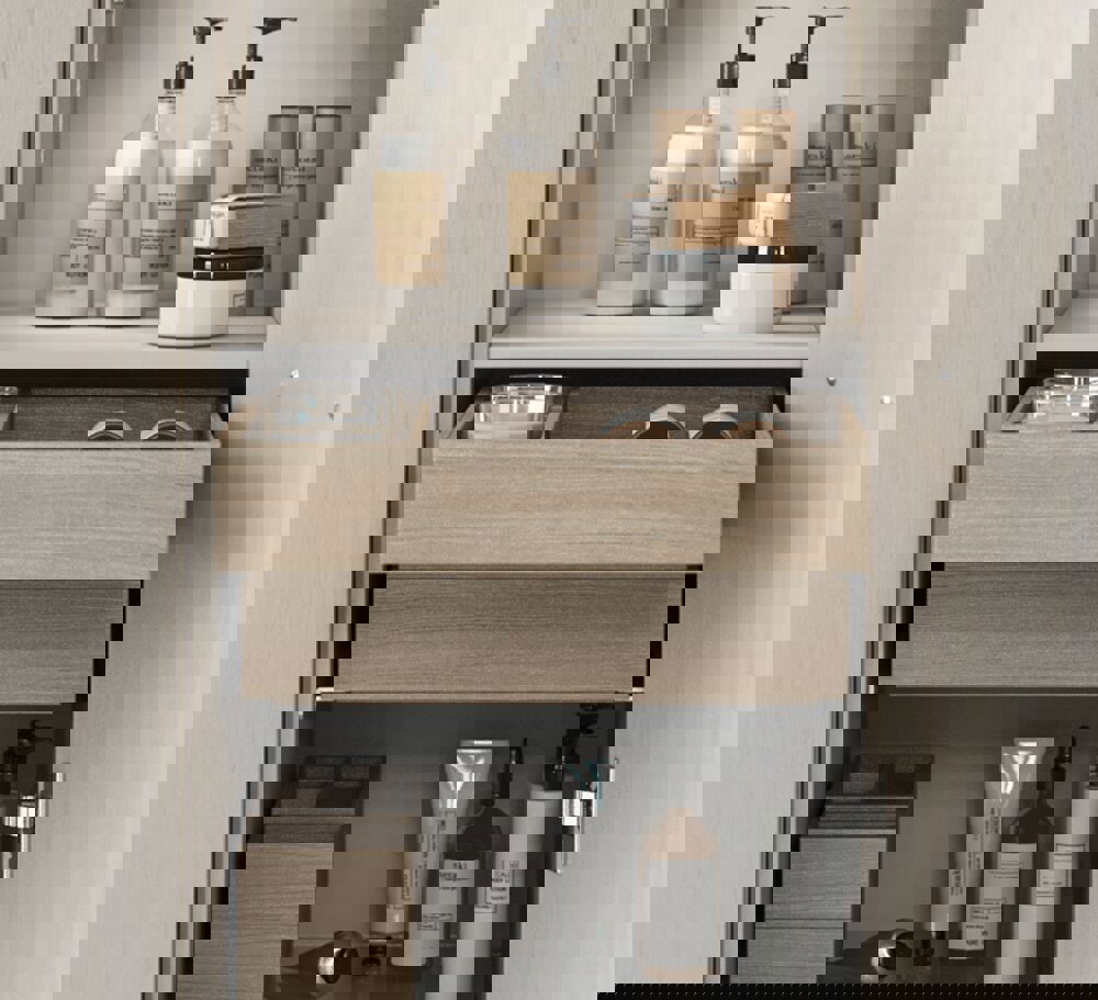 Mit den Dansani Calidris Hochschränken wird die Aufbewahrung im Bad einfach und stilvoll. Diese Schränke sind nicht nur ein funktionales Element, sondern auch ein ästhetisches Vergnügen, das sich perfekt in moderne Badeinrichtungen einfügt. Die Calidris-Hochschränke verfügen über clevere Einlegeböden und Fächer, die es Ihnen ermöglichen, alles von Handtüchern über Toilettenartikel bis hin zu Schönheitsprodukten geordnet zu organisieren. Das elegante Design und die klaren Linien der Hochschränke bringen ein Gefühl von Ordnung und Harmonie in die Badumgebung. OBS: Für Produkte mit Eiche und wahlfreie Farbe fällt eine Aufpreis (BI1) an. Einmalige Berechnung, unabhängig von der Anzahl der Elemente. Überlegen Sie Ihre Badmöbel mit praktischem Zubehör auszustatten, an denen Sie täglich Freude haben werden. Wie z.B. LED-Beleuchtung in den Schubladen, Innenbeleuchtung in den Schränken, eine eingebaute Steckdose und LED-Beleuchtung unter dem Schrank inkl. Bewegungssensor und Lichtsteuerung die Ihren nächtlichen Besuch im Bad führt. Das Zubehör wählen Sie direkt mit Ihren Möbeln aus.