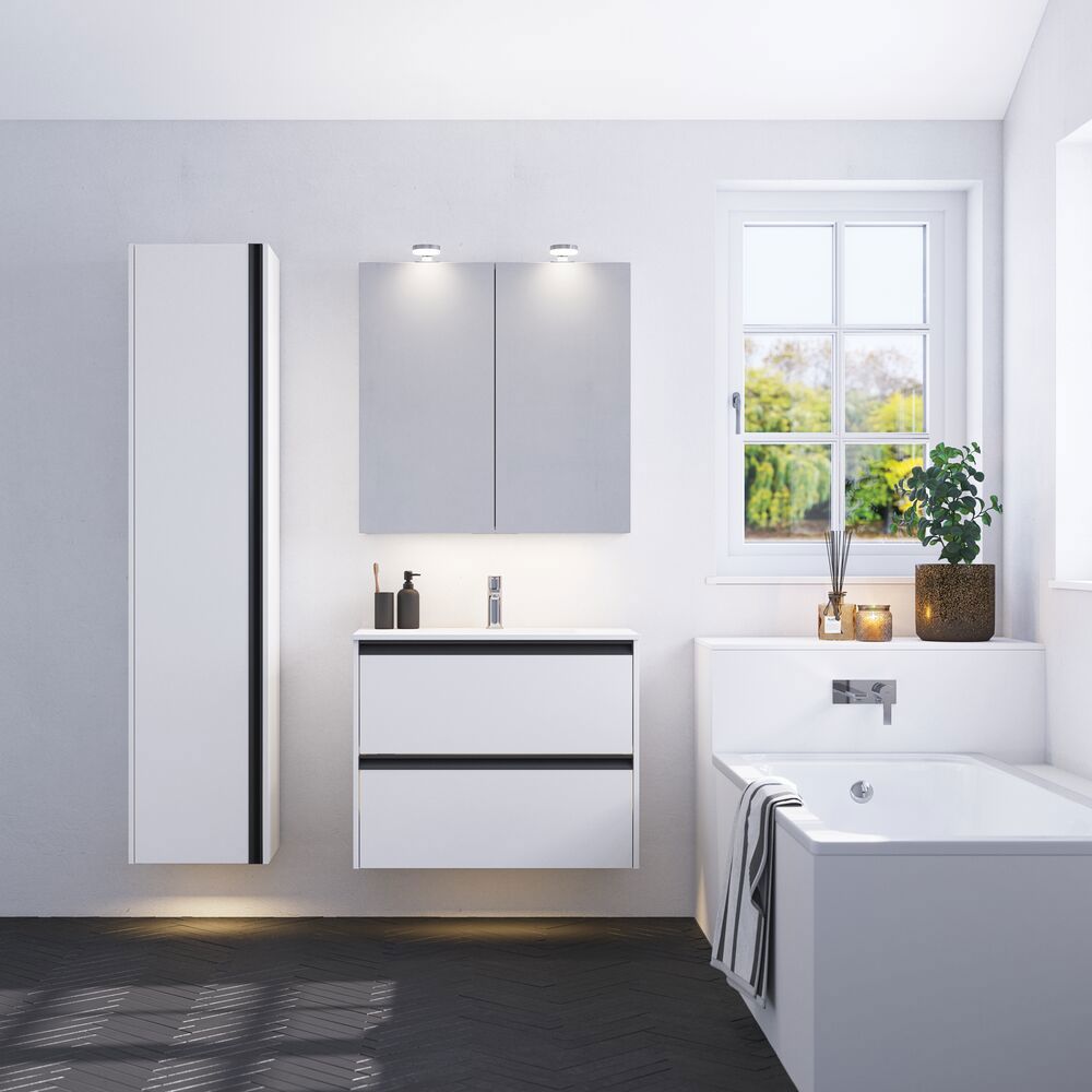 Der Hochschrank in Version B mit integriertem Griff ist perfekt für Sie, wenn Sie sowohl Stil als auch Funktionalität wünschen. Mit einem Holzregal und drei verkürzten Glasregalen ist dieser Schrank ideal für die Aufbewahrung verschiedener Badezimmerartikel. Die drei Holzschalen an der Tür sind perfekt für kleine Gegenstände, während die beiden Glasregale es ermöglichen, Ihre Lieblingsprodukte zur Schau zu stellen. Die elegante schwarze Farbe des Griffs schafft einen schönen Kontrast und verleiht Ihrem Badezimmer einen raffinierten Touch. OBS: Für Produkte mit wahlfreie Farbe fällt eine Aufpreis (BI1) an. Einmalige Berechnung, unabhängig von der Anzahl der Elemente. Überlegen Sie Ihre Badmöbel mit praktischem Zubehör auszustatten, an denen Sie täglich Freude haben werden. Wie z.B. LED-Beleuchtung in den Schubladen, Innenbeleuchtung in den Schränken, eine eingebaute Steckdose und LED-Beleuchtung unter dem Schrank inkl. Bewegungssensor und Lichtsteuerung die Ihren nächtlichen Besuch im Bad führt. Das Zubehör wählen Sie direkt mit Ihren Möbeln aus.