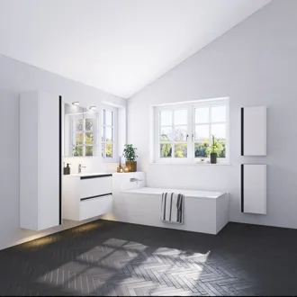 Der Hochschrank in Version B mit integriertem Griff ist perfekt für Sie, wenn Sie sowohl Stil als auch Funktionalität wünschen. Mit einem Holzregal und drei verkürzten Glasregalen ist dieser Schrank ideal für die Aufbewahrung verschiedener Badezimmerartikel. Die drei Holzschalen an der Tür sind perfekt für kleine Gegenstände, während die beiden Glasregale es ermöglichen, Ihre Lieblingsprodukte zur Schau zu stellen. Die elegante schwarze Farbe des Griffs schafft einen schönen Kontrast und verleiht Ihrem Badezimmer einen raffinierten Touch. OBS: Für Produkte mit wahlfreie Farbe fällt eine Aufpreis (BI1) an. Einmalige Berechnung, unabhängig von der Anzahl der Elemente. Überlegen Sie Ihre Badmöbel mit praktischem Zubehör auszustatten, an denen Sie täglich Freude haben werden. Wie z.B. LED-Beleuchtung in den Schubladen, Innenbeleuchtung in den Schränken, eine eingebaute Steckdose und LED-Beleuchtung unter dem Schrank inkl. Bewegungssensor und Lichtsteuerung die Ihren nächtlichen Besuch im Bad führt. Das Zubehör wählen Sie direkt mit Ihren Möbeln aus.