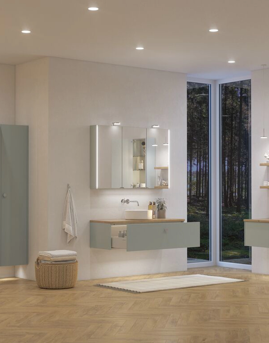 Wählen Sie den Hochschrank mit glatter Front in Version C für die ultimative Lösung zur Aufbewahrung. Dieser Schrank hat ein Holzregal, drei verkürzte Glasregale, drei Holzschalen an der Tür sowie zwei Ausziehregale und einen Wäschebeutel. Er ist ideal, um Ihr Badezimmer ordentlich und aufgeräumt zu halten, sodass Sie Ihre täglichen Bedürfnisse leicht finden können. Die glatte Oberfläche und das elegante Design machen ihn zu einem zentralen Element in Ihrem Badezimmer, das sowohl funktional als auch ästhetisch ansprechend ist. OBS: Für Produkte mit wahlfreie Farbe fällt eine Aufpreis (BI1) an. Einmalige Berechnung, unabhängig von der Anzahl der Elemente. Überlegen Sie Ihre Badmöbel mit praktischem Zubehör auszustatten, an denen Sie täglich Freude haben werden. Wie z.B. LED-Beleuchtung in den Schubladen, Innenbeleuchtung in den Schränken, eine eingebaute Steckdose und LED-Beleuchtung unter dem Schrank inkl. Bewegungssensor und Lichtsteuerung die Ihren nächtlichen Besuch im Bad führt. Das Zubehör wählen Sie direkt mit Ihren Möbeln aus.