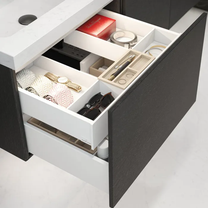 Optimieren Sie Ihre Aufbewahrung mit der Dansani Calidris Innenschublade, die perfekt in Ihren Waschtischunterschrank passt. Diese clevere Ergänzung bietet Ihnen zusätzlichen Platz, um Ihre Badutensilien zu organisieren, ohne Platz im Rest Ihres Waschtischs oder auf den Regalen Ihrer Schränke zu beanspruchen. Die Innenschublade ist nicht sehr hoch, aber sie kann viele kleine Gegenstände aufnehmen und sorgt so für mehr Übersicht und Ordnung im Bad.