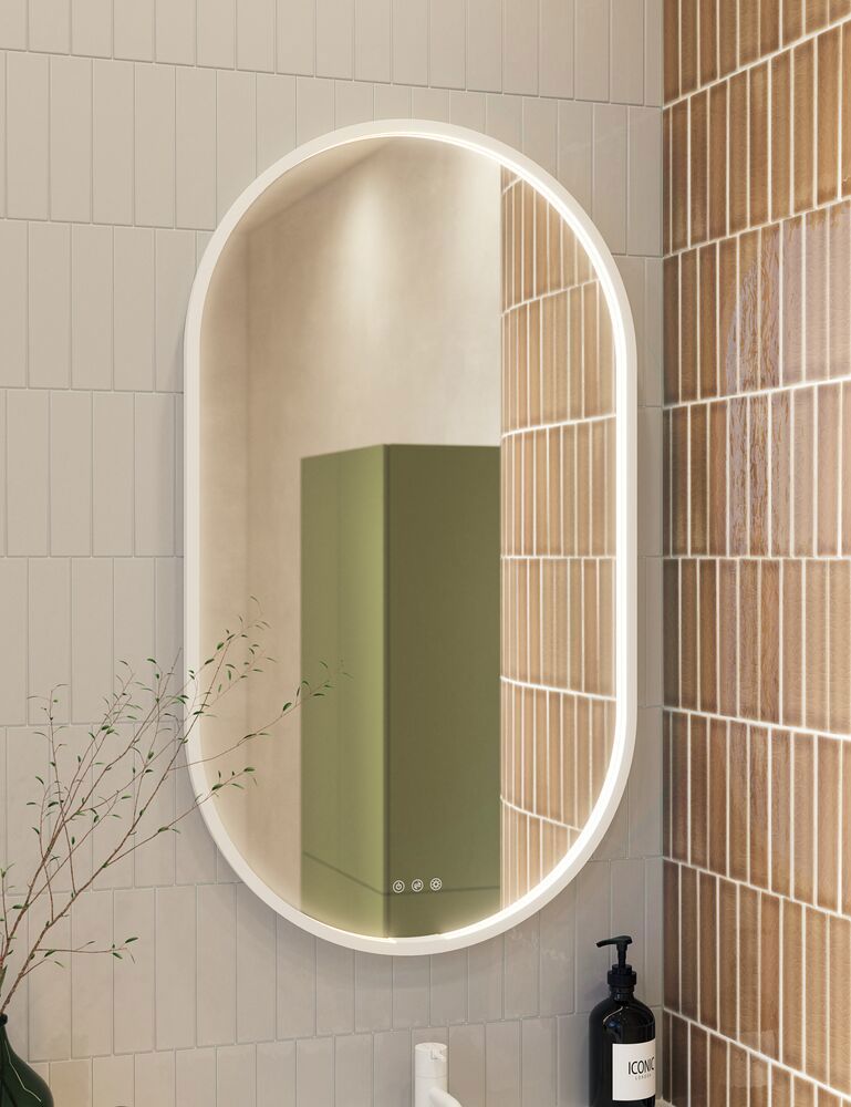Der Moon Spiegel ist ein schöner und eleganter Spiegel mit einem Rahmen, der ihn zu einem dekorativen Element in jedem Interieur macht. Der Spiegel mit seiner ovalen Form mildert die sonst scharfen Kanten im Badezimmer. Der stabile Rahmen des Spiegels ist aus robusten Materialien hergestellt und verleiht dem Spiegel ein modernes und stilvolles Aussehen. Sie können auch die Stärke und Wärme des Lichts steuern, denn der ovale Spiegel Moon ist mit Lichtsteuerung ausgestattet. Der Rahmen des Spiegels ist in verschiedenen Farben wie Schwarz, Weiß und Messing erhältlich, so dass Sie ihn an Ihren persönlichen Stil und Ihre Einrichtung anpassen können. Perfekt für das Badezimmer oder das Schlafzimmer, mit dem Moon Oval Mirror können Sie einen Raum mit Eleganz und zeitloser Schönheit schaffen.Der Moon Oval Mirror ist in den Farben Schwarz, Weiß und Messing erhältlich. Sie können ein vormontiertes Wärmefeld für den Spiegel kaufen, um zu verhindern, dass der Spiegel beim Duschen beschlägt.