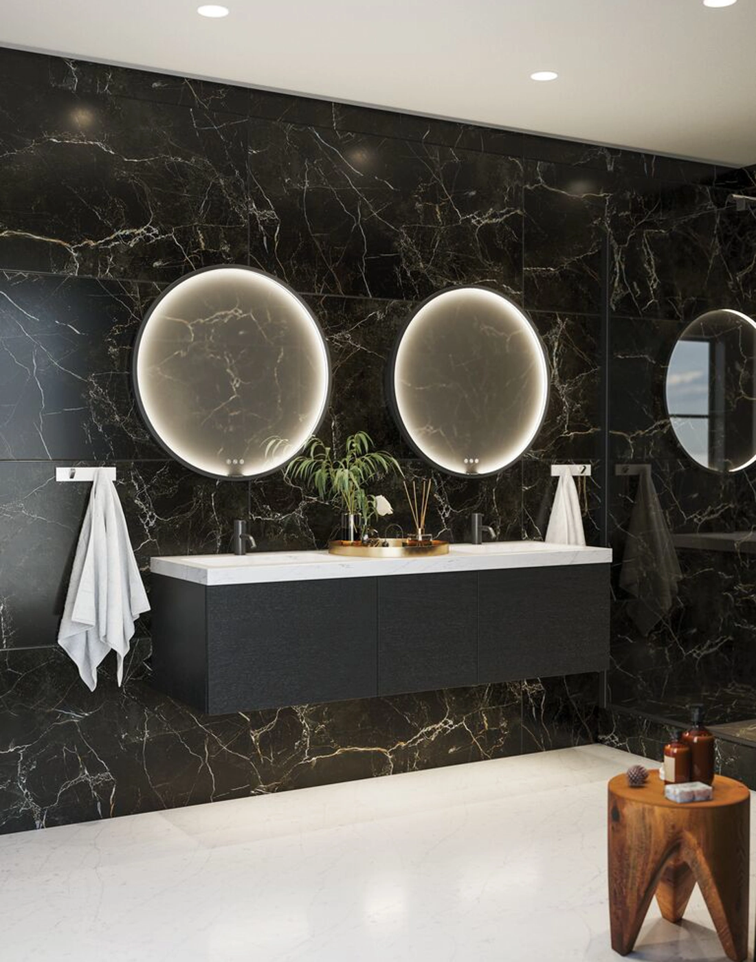 Der Moon Spiegel ist ein schöner und eleganter runder Spiegel mit einem Rahmen, der ihn zu einem dekorativen Element in jedem Interieur macht. Der stabile Rahmen des Spiegels ist aus robusten Materialien gefertigt und verleiht dem Spiegel einen modernen und stilvollen Ausdruck. Sie können auch die Stärke und Wärme des Lichts steuern, denn der Moon-Spiegel ist natürlich mit Lichtsteuerung erhältlich. Der Rahmen des Spiegels ist in verschiedenen Farben wie Schwarz, Weiß und Messing erhältlich, so dass Sie ihn an Ihren persönlichen Stil und Ihre Einrichtung anpassen können. Der Spiegel ist perfekt für das Badezimmer oder Schlafzimmer und mit dem Moon Spiegel können Sie einen Raum mit Eleganz und zeitloser Schönheit schaffen. Sie können ein vormontiertes Wärmefeld für den Spiegel kaufen, um zu verhindern, dass der Spiegel beim Duschen beschlägt.