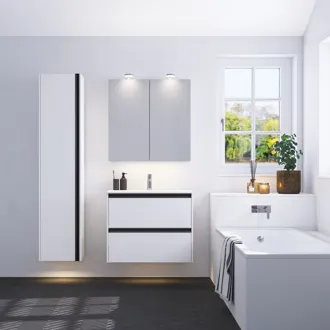 Verleihen Sie Ihrem Badezimmer einen modernen Touch mit einem Oberschrank mit integriertem Griff. Das schlichte, aber stilvolle Design dieses Schranks macht ihn zu einer idealen Lösung zur Optimierung des Platzes. Die beiden Glaseinlegeböden ermöglichen es, Ihre Badezimmerartikel zu präsentieren und sie organisiert zu halten. Mit diesem Oberschrank erhalten Sie nicht nur praktische Aufbewahrung, sondern auch ein schönes Detail, das sich mit einem offenen Regal kombinieren lässt und sowohl Funktionalität als auch Ästhetik in Ihr Badezimmer bringt. OBS: Für Produkte mit wahlfreie Farbe fällt eine Aufpreis (BI1) an. Einmalige Berechnung, unabhängig von der Anzahl der Elemente. Überlegen Sie Ihre Badmöbel mit praktischem Zubehör auszustatten, an denen Sie täglich Freude haben werden. Wie z.B. LED-Beleuchtung in den Schubladen, Innenbeleuchtung in den Schränken, eine eingebaute Steckdose und LED-Beleuchtung unter dem Schrank inkl. Bewegungssensor und Lichtsteuerung die Ihren nächtlichen Besuch im Bad führt. Das Zubehör wählen Sie direkt mit Ihren Möbeln aus.