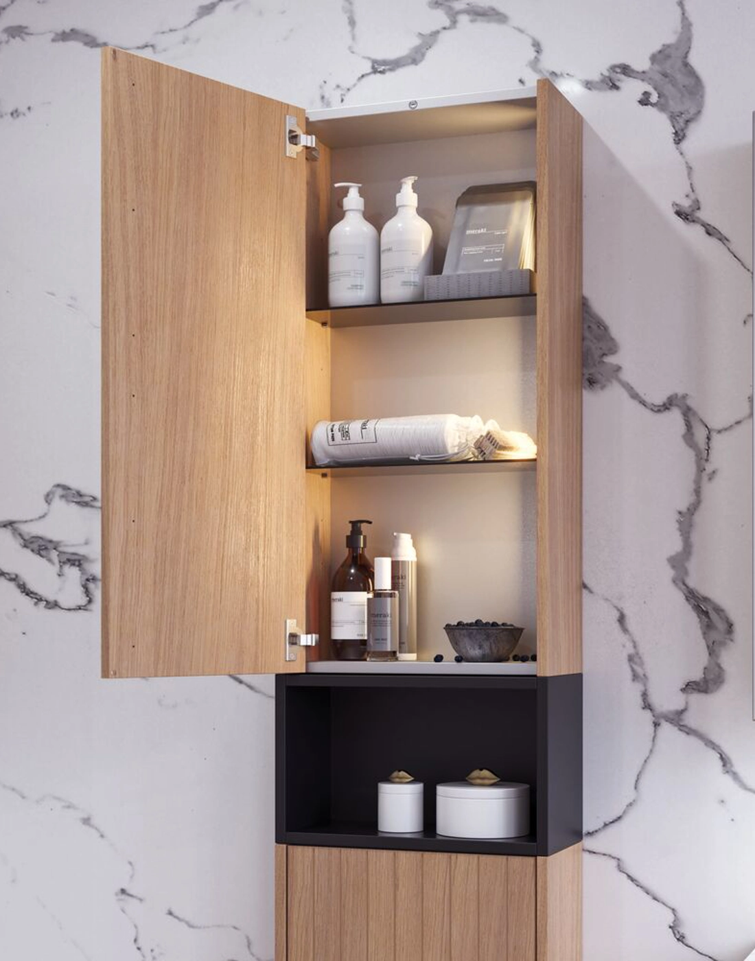 Schaffen Sie eine gemütliche und einladende Atmosphäre mit einem Oberschrank mit Profilfront. Die beiden Glaseinlegeböden bieten viel Platz, um Ihre Favoriten zu organisieren und auszustellen, während das einzigartige Design Charakter in Ihr Badezimmer bringt. Mit einer Breite von 40 cm und einer Tiefe von 19 cm ist dieser Schrank perfekt, um den Stauraum zu maximieren. In Kombination mit einem offenen Regal erhalten Sie eine clevere und stilvolle Lösung, die sowohl Funktionalität als auch Persönlichkeit in den Raum hervorhebt. Überlegen Sie Ihre Badmöbel mit praktischem Zubehör auszustatten, an denen Sie täglich Freude haben werden. Wie z.B. LED-Beleuchtung in den Schubladen, Innenbeleuchtung in den Schränken, eine eingebaute Steckdose und LED-Beleuchtung unter dem Schrank inkl. Bewegungssensor und Lichtsteuerung die Ihren nächtlichen Besuch im Bad führt. Das Zubehör wählen Sie direkt mit Ihren Möbeln aus.
