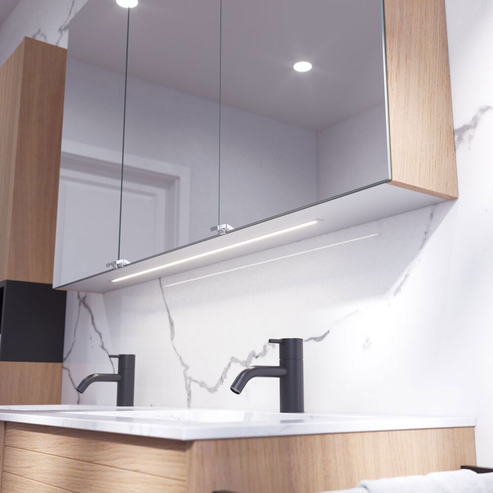 Schaffen Sie eine gemütliche und einladende Atmosphäre mit einem Oberschrank mit Profilfront. Die beiden Glaseinlegeböden bieten viel Platz, um Ihre Favoriten zu organisieren und auszustellen, während das einzigartige Design Charakter in Ihr Badezimmer bringt. Mit einer Breite von 40 cm und einer Tiefe von 19 cm ist dieser Schrank perfekt, um den Stauraum zu maximieren. In Kombination mit einem offenen Regal erhalten Sie eine clevere und stilvolle Lösung, die sowohl Funktionalität als auch Persönlichkeit in den Raum hervorhebt. Überlegen Sie Ihre Badmöbel mit praktischem Zubehör auszustatten, an denen Sie täglich Freude haben werden. Wie z.B. LED-Beleuchtung in den Schubladen, Innenbeleuchtung in den Schränken, eine eingebaute Steckdose und LED-Beleuchtung unter dem Schrank inkl. Bewegungssensor und Lichtsteuerung die Ihren nächtlichen Besuch im Bad führt. Das Zubehör wählen Sie direkt mit Ihren Möbeln aus.