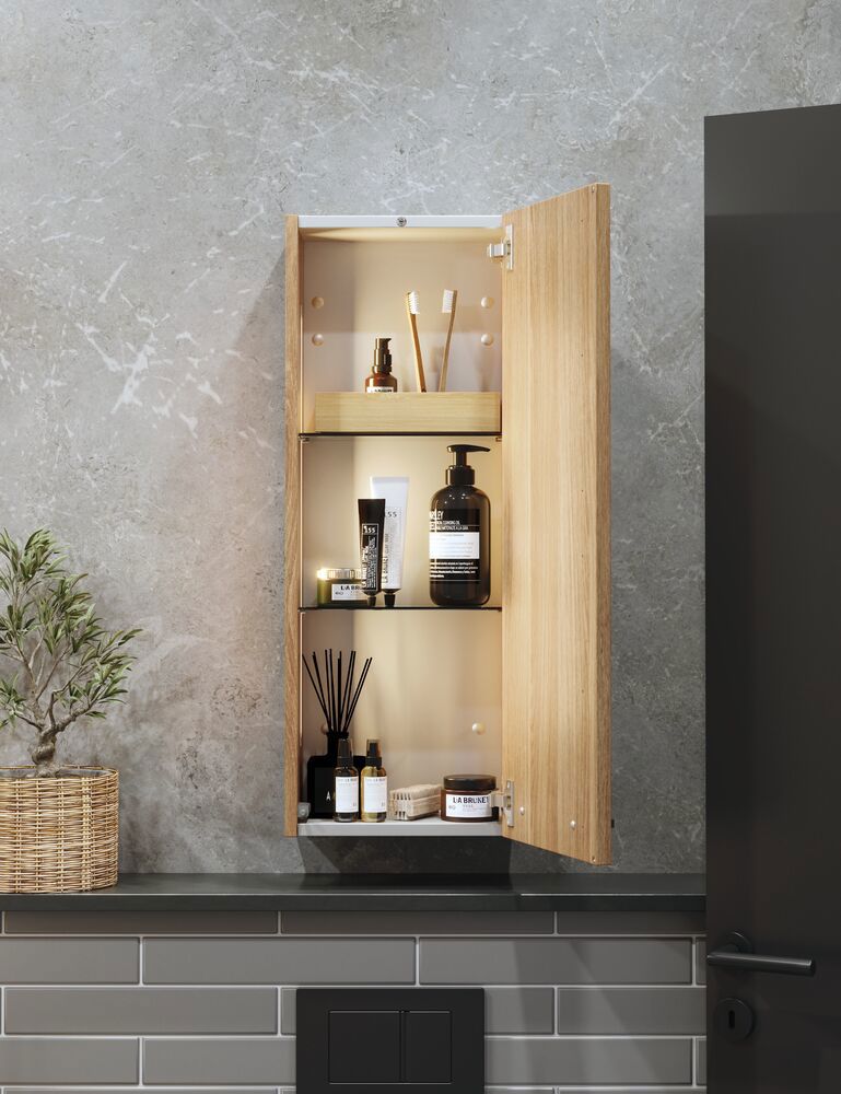 Mit den Hängeschränken schaffen Sie Platz und Ordnung in Ihrem Badezimmer. Erhältlich mit 2 Glasböden, ist dieser elegante Schrank sowohl stilvoll als auch funktional. Verwenden Sie den Schrank als Stauraum in Ihrem Badezimmer, um Ihre Cremes, Deodorants usw. geordnet aufzubewahren. Der Schrank ist in verschiedenen Farben erhältlich, die zum Rest Ihres Badezimmers passen. OBS: Für Produkte mit wahlfreie Farbe fällt eine Aufpreis (BI1) an. Einmalige Berechnung, unabhängig von der Anzahl der Elemente. Überlegen Sie Ihre Badmöbel mit praktischem Zubehör auszustatten, an denen Sie täglich Freude haben werden. Wie z.B. LED-Beleuchtung in den Schubladen, Innenbeleuchtung in den Schränken, eine eingebaute Steckdose und LED-Beleuchtung unter dem Schrank inkl. Bewegungssensor und Lichtsteuerung die Ihren nächtlichen Besuch im Bad führt. Das Zubehör wählen Sie direkt mit Ihren Möbeln aus.