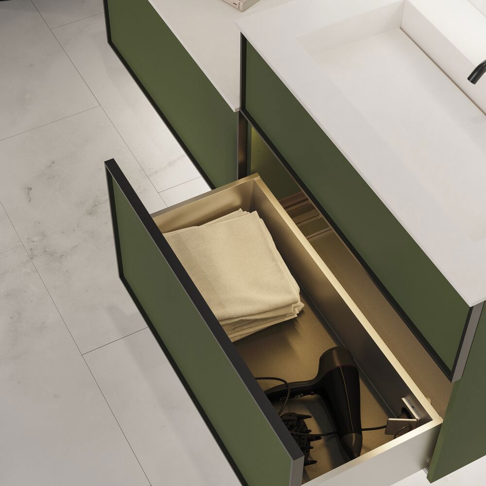 Schaffen Sie das perfekte Badezimm Erlebnis mit dem Unterschrank mit einer Schublade. Dieser vielseitige Unterschrank ist die ideale Ergänzung zu Ihrem Waschtischunterschrank und verfügt über eine geräumige Schublade, die all Ihre wichtigen Toilettenartikel problemlos verstauen kann. Der stilvolle schwarze Rahmen um die Schublade verleiht dem Unterschrank einen modernen und raffinierten Look. Mit diesem Unterschrank erhalten Sie nicht nur praktischen Stauraum, sondern auch eine ästhetische Lösung, die Ihrem Badezimmer Charakter verleiht. OBS: Für Produkte mit wahlfreie Farbe fällt eine Aufpreis (BI1) an. Einmalige Berechnung, unabhängig von der Anzahl der Elemente. Überlegen Sie Ihre Badmöbel mit praktischem Zubehör auszustatten, an denen Sie täglich Freude haben werden. Wie z.B. LED-Beleuchtung in den Schubladen, Innenbeleuchtung in den Schränken, eine eingebaute Steckdose und LED-Beleuchtung unter dem Schrank inkl. Bewegungssensor und Lichtsteuerung die Ihren nächtlichen Besuch im Bad führt. Das Zubehör wählen Sie direkt mit Ihren Möbeln aus.