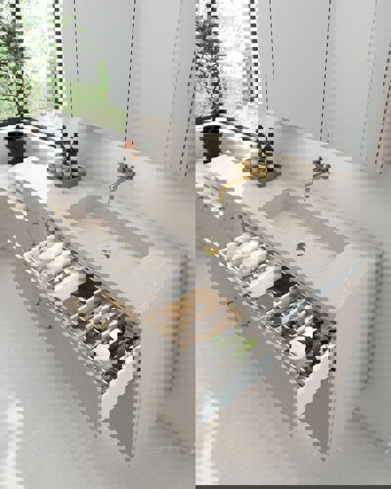 Dansani Calidris Schränke mit 1 Schublade sind die ideale Lösung für eine intelligente und stilvolle Aufbewahrung im Badezimmer. Ohne Platz für Abflüsse sind diese Schränke für diejenigen, die sich für eine asymmetrische Lösung mit einem maßgeschneiderten Waschbecken entscheiden, oder für diejenigen, die zusätzlichen Stauraum an anderer Stelle im Bad wünschen. Die geräumige Schublade sorgt für Ordnung im Bad und bietet viel Platz für Cremes, Shampoo, Haartrockner und vieles mehr. Der Dansani Calidris Schrank gibt Ihnen die Möglichkeit, Ihr Bad auf eine kohärente und schöne Art zu organisieren. OBS: Für Produkte mit Eiche und wahlfreie Farbe fällt eine Aufpreis (BI1) an. Einmalige Berechnung, unabhängig von der Anzahl der Elemente. Überlegen Sie Ihre Badmöbel mit praktischem Zubehör auszustatten, an denen Sie täglich Freude haben werden. Wie z.B. LED-Beleuchtung in den Schubladen, Innenbeleuchtung in den Schränken, eine eingebaute Steckdose und LED-Beleuchtung unter dem Schrank inkl. Bewegungssensor und Lichtsteuerung die Ihren nächtlichen Besuch im Bad führt. Das Zubehör wählen Sie direkt mit Ihren Möbeln aus.