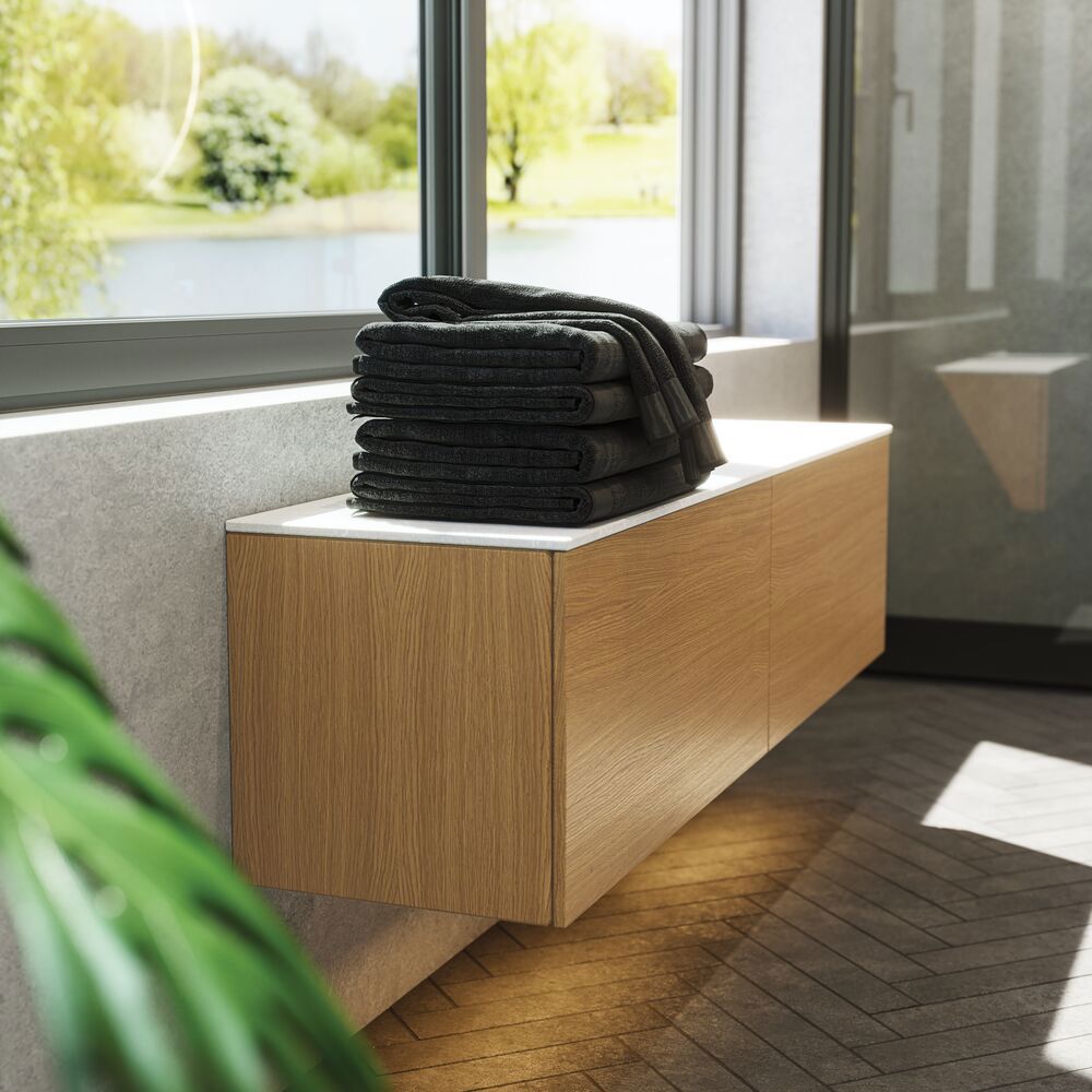 Gestalten Sie ein einzigartiges und einladendes Badezimmer mit einem Unterschrank mit Profilfront und zwei Schubladen. Dieser Schrank kombiniert Funktionalität mit einem auffälligen Design, das dem Raum ein interessantes visuelles Element verleiht. Die beiden Schubladen bieten ausreichend Stauraum, sodass Sie Ihre Badezimmerartikel leicht im Blick behalten können. Ob allein mit einer Arbeitsplatte oder zusammen mit einem Waschbecken, dieser Schrank bietet sowohl praktische Lösungen als auch einen stilvollen Akzent. Wählen Sie aus mehreren Farben, um den Schrank an Ihre Einrichtung anzupassen. Überlegen Sie Ihre Badmöbel mit praktischem Zubehör auszustatten, an denen Sie täglich Freude haben werden. Wie z.B. LED-Beleuchtung in den Schubladen, Innenbeleuchtung in den Schränken, eine eingebaute Steckdose und LED-Beleuchtung unter dem Schrank inkl. Bewegungssensor und Lichtsteuerung die Ihren nächtlichen Besuch im Bad führt. Das Zubehör wählen Sie direkt mit Ihren Möbeln aus.