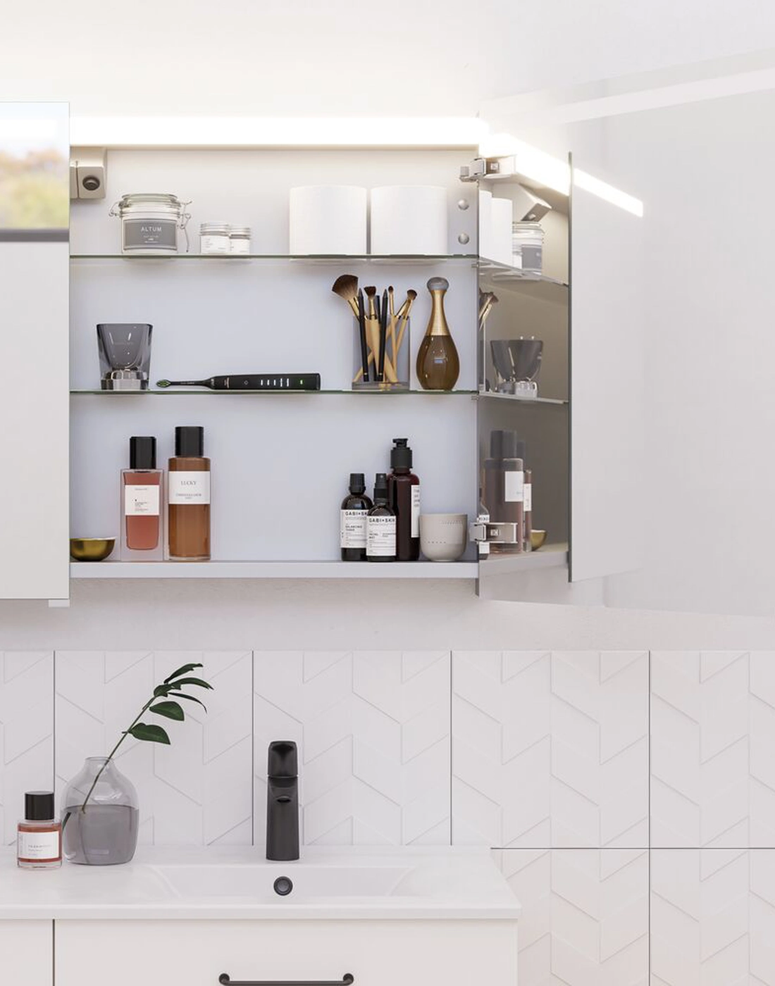 Mit dem Spiegelschrank Top bringen Sie Ihren Morgen in Schwung. Dieser Spiegelschrank ist oben mit integrierter Beleuchtung ausgestattet, und im Inneren des Spiegelschranks finden Sie viel Stauraum und eine Steckdose mit Schalter. Sie bekommen also viel mehr, als Sie vielleicht erwarten. Die Seitenteile der Spiegelschrank sind selbstverständlich in schönen Farben erhältlich, so dass Sie den Spiegelschrank auf Ihre Badmöbel und den Rest des Badezimmers abstimmen können.