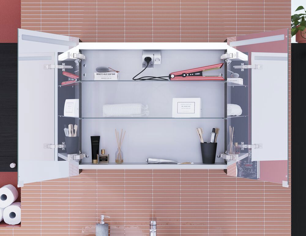 Mit dem Spiegelschrank Top bringen Sie Ihren Morgen in Schwung. Dieser Spiegelschrank ist oben mit integrierter Beleuchtung ausgestattet, und im Inneren des Spiegelschranks finden Sie viel Stauraum und eine Steckdose mit Schalter. Sie bekommen also viel mehr, als Sie vielleicht erwarten. Die Seitenteile der Spiegelschrank sind selbstverständlich in schönen Farben erhältlich, so dass Sie den Spiegelschrank auf Ihre Badmöbel und den Rest des Badezimmers abstimmen können.