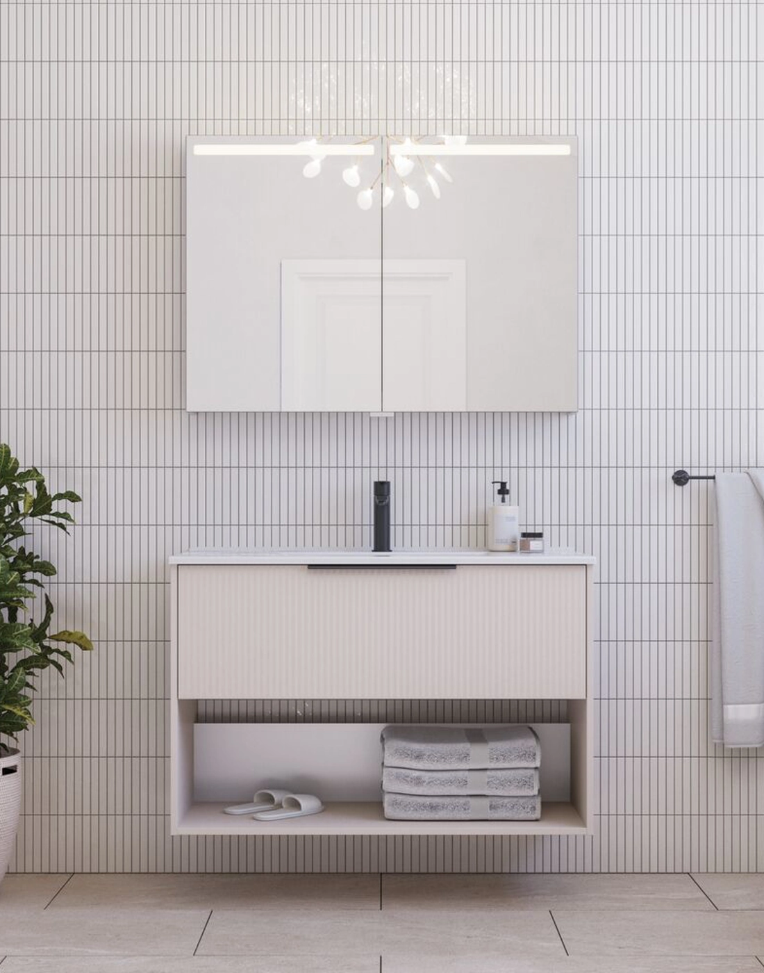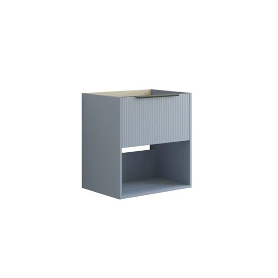 Dieser Waschtischunterschrank vereint das Beste aus zwei Welten: eine praktische Schublade, eine offene Fläche zur Präsentation Ihrer Lieblingsstücke und eine gestreifte Front für einen einzigartigen und eleganten Look. Wählen Sie zwischen den Farben Weiß, Sand oder Hellblau und finden Sie die Farbe, die am besten zu Ihrem Badezimmer passt. Der Griff ist bereits montiert, so dass er sofort einsatzbereit ist.