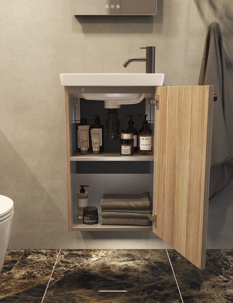 Der 1-türige Waschtischunterschrank ist die ideale Lösung für kleine Bäder. Mit einer Tiefe von nur 26 cm nimmt er nur wenig Platz in Anspruch, bietet aber dennoch praktischen Stauraum. Das stilvolle Design passt perfekt zu jeder Inneneinrichtung. Der Schrank ist sowohl funktional als auch ästhetisch ansprechend und hilft, Ordnung und Eleganz in Ihrem Badezimmer zu schaffen. Verschönern Sie Ihren Raum mit diesem Waschtischunterschrank und genießen Sie die intelligente, platzsparende Lösung. OBS: Für Produkte mit wahlfreie Farbe fällt eine Aufpreis (BI1) an. Einmalige Berechnung, unabhängig von der Anzahl der Elemente. Überlegen Sie Ihre Badmöbel mit praktischem Zubehör auszustatten, an denen Sie täglich Freude haben werden. Wie z.B. LED-Beleuchtung in den Schubladen, Innenbeleuchtung in den Schränken, eine eingebaute Steckdose und LED-Beleuchtung unter dem Schrank inkl. Bewegungssensor und Lichtsteuerung die Ihren nächtlichen Besuch im Bad führt. Das Zubehör wählen Sie direkt mit Ihren Möbeln aus.