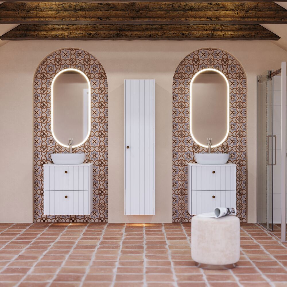 Diese Waschtischunterschränke mit 2 Schubladen bieten ein charmantes Retro-Design für Ihr Badezimmer. Die geschwungenen Fronten mit Rillen erzeugen einen charaktervollen Look. Die Schränke sind in verschiedenen Farben erhältlich, so dass Sie die Farbe wählen können, die am besten zu Ihrem persönlichen Stil passt. Die Schränke sehen nicht nur schön aus, sondern sind auch praktisch: In zwei geräumigen Schubladen können Sie Ihre Utensilien verstauen. Verleihen Sie Ihrem Bad zeitlose Eleganz mit den Waschtischunterschränken und genießen Sie den einzigartigen Touch, den sie dem Raum verleihen. OBS: Für Produkte mit wahlfreie Farbe fällt eine Aufpreis (BI1) an. Einmalige Berechnung, unabhängig von der Anzahl der Elemente. Überlegen Sie Ihre Badmöbel mit praktischem Zubehör auszustatten, an denen Sie täglich Freude haben werden. Wie z.B. LED-Beleuchtung in den Schubladen, Innenbeleuchtung in den Schränken, eine eingebaute Steckdose und LED-Beleuchtung unter dem Schrank inkl. Bewegungssensor und Lichtsteuerung die Ihren nächtlichen Besuch im Bad führt. Das Zubehör wählen Sie direkt mit Ihren Möbeln aus.