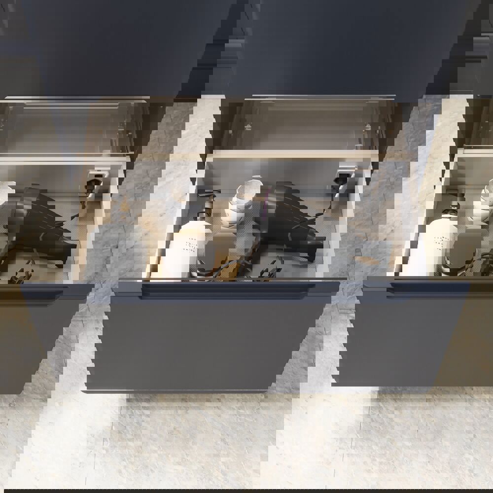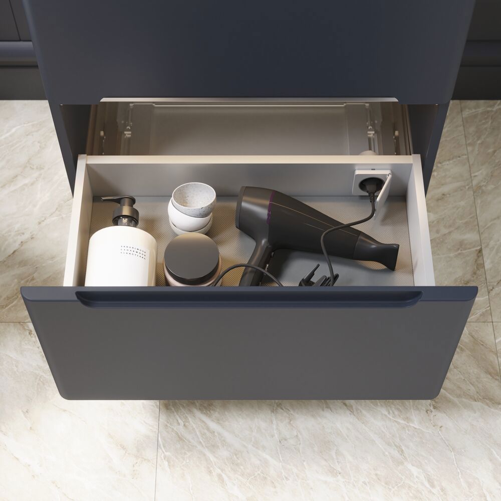 Betonen Sie Ihr Badezimmer mit einem eleganten Waschtischunterschrank, der weiche, abgerundete Formen mit einem schlanken Design kombiniert – perfekt für einen femininen Vintage-Look. Die moderne Front bewahrt den Charme und die Einfachheit klassischer Kommoden und schafft eine zeitlose Atmosphäre mit einem Hauch von Eleganz. Die integrierten Griffe in der Profilfront unterstreichen das minimalistische Design, während Sie zwischen einem reinen Weiß oder einer einzigartigen Nuance wählen können, die perfekt zu Ihrem persönlichen Stil passt. Als zusätzliches Detail kann der Schrank mit dekorativen schwarzen Beinen ausgestattet werden, die dem Badezimmer eine leichte und luftige Optik verleihen. OBS: Für Produkte mit wahlfreie Farbe fällt eine Aufpreis (BI1) an. Einmalige Berechnung, unabhängig von der Anzahl der Elemente. Überlegen Sie Ihre Badmöbel mit praktischem Zubehör auszustatten, an denen Sie täglich Freude haben werden. Wie z.B. LED-Beleuchtung in den Schubladen, Innenbeleuchtung in den Schränken, eine eingebaute Steckdose und LED-Beleuchtung unter dem Schrank inkl. Bewegungssensor und Lichtsteuerung die Ihren nächtlichen Besuch im Bad führt. Das Zubehör wählen Sie direkt mit Ihren Möbeln aus.