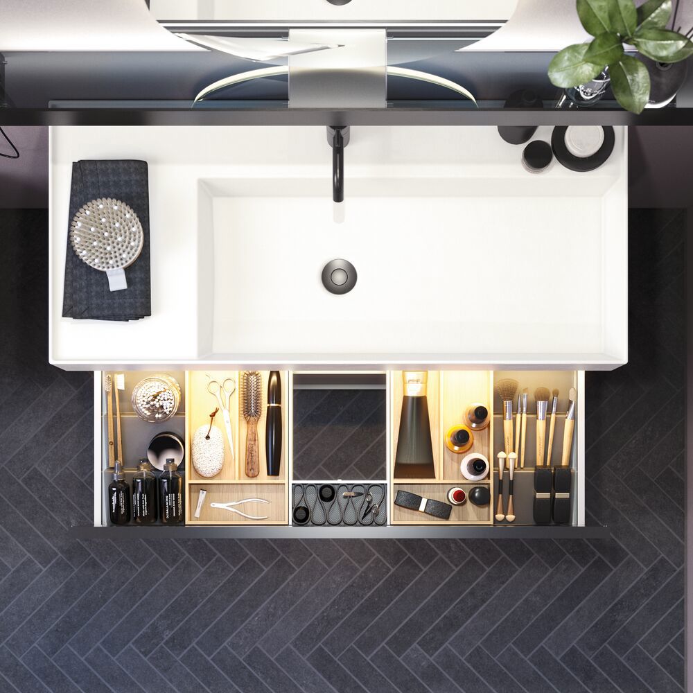 Upgrade dein Badezimmer mit einem Waschtischunterschrank mit 2 Schubladen. Dieser stilvolle Schrank ist 64 cm hoch und 44 cm tief, was ihn ideal zur Organisation deiner Badezimmerartikel macht. Der elegante schwarze Rahmen um die Schubladen verleiht dem Schrank einen modernen und eleganten Ausdruck, der zu jeder Einrichtung passt. Wähle aus verschiedenen Farben, um die beste Übereinstimmung für deinen Stil zu finden. Dieser Waschtischunterschrank ermöglicht es dir, deine Badezimmerartikel einfach zu organisieren und alles ordentlich zu halten. Der Waschtischunterschrank mit 2 Schubladen kombiniert praktische Funktionalität mit einem schönen Design und ist somit eine perfekte Ergänzung für dein Badezimmer. Mache deinen Raum mit diesem fantastischen Waschtischunterschrank organisierter und stilvoller. OBS: Für Produkte mit wahlfreie Farbe fällt eine Aufpreis (BI1) an. Einmalige Berechnung, unabhängig von der Anzahl der Elemente. Überlegen Sie Ihre Badmöbel mit praktischem Zubehör auszustatten, an denen Sie täglich Freude haben werden. Wie z.B. LED-Beleuchtung in den Schubladen, Innenbeleuchtung in den Schränken, eine eingebaute Steckdose und LED-Beleuchtung unter dem Schrank inkl. Bewegungssensor und Lichtsteuerung die Ihren nächtlichen Besuch im Bad führt. Das Zubehör wählen Sie direkt mit Ihren Möbeln aus.