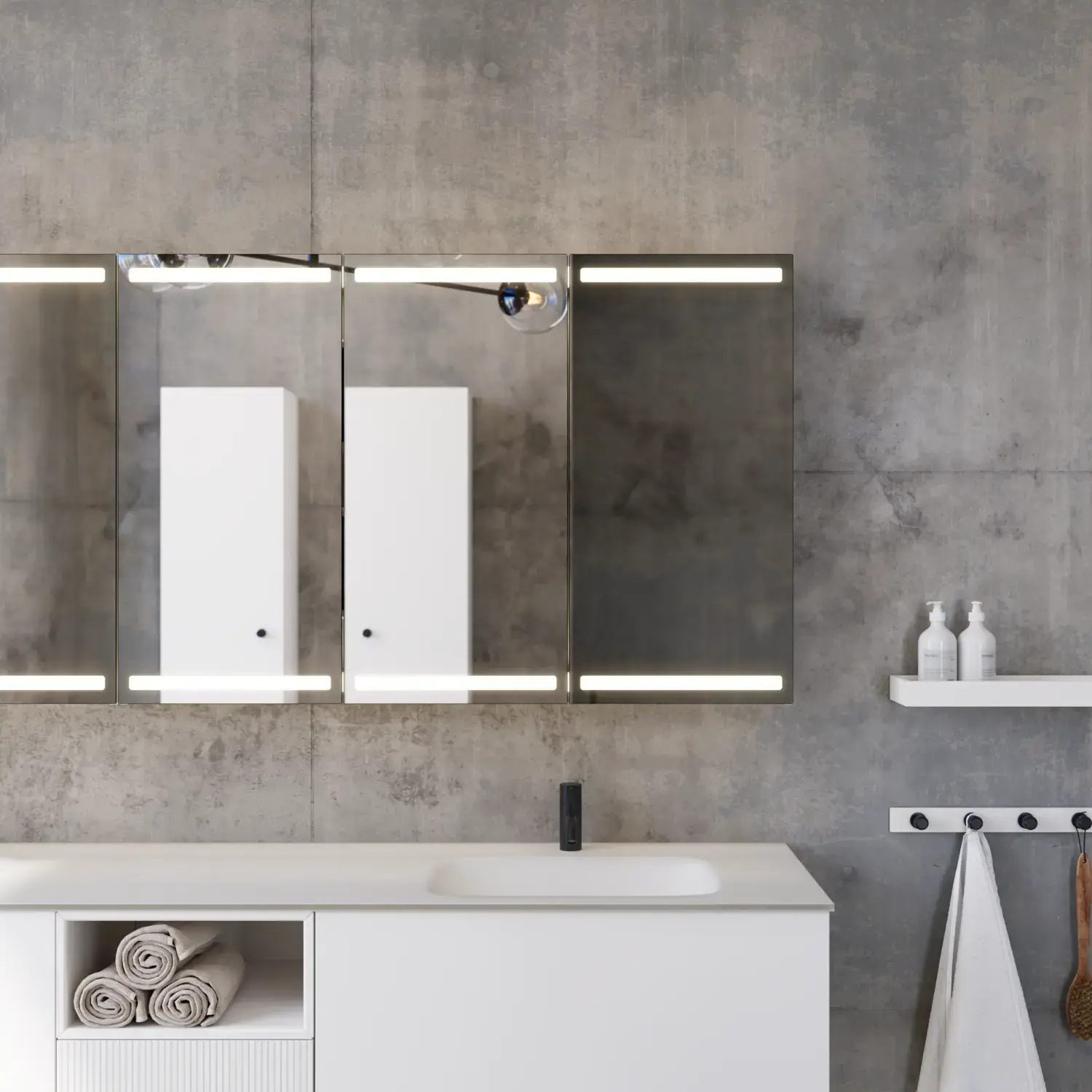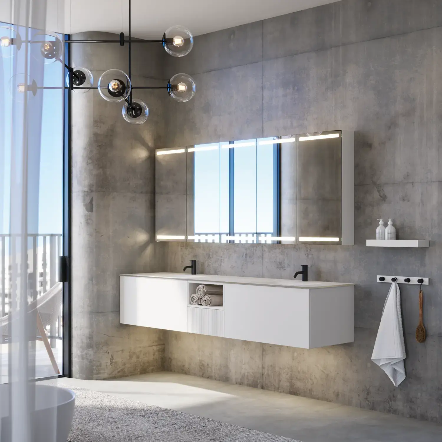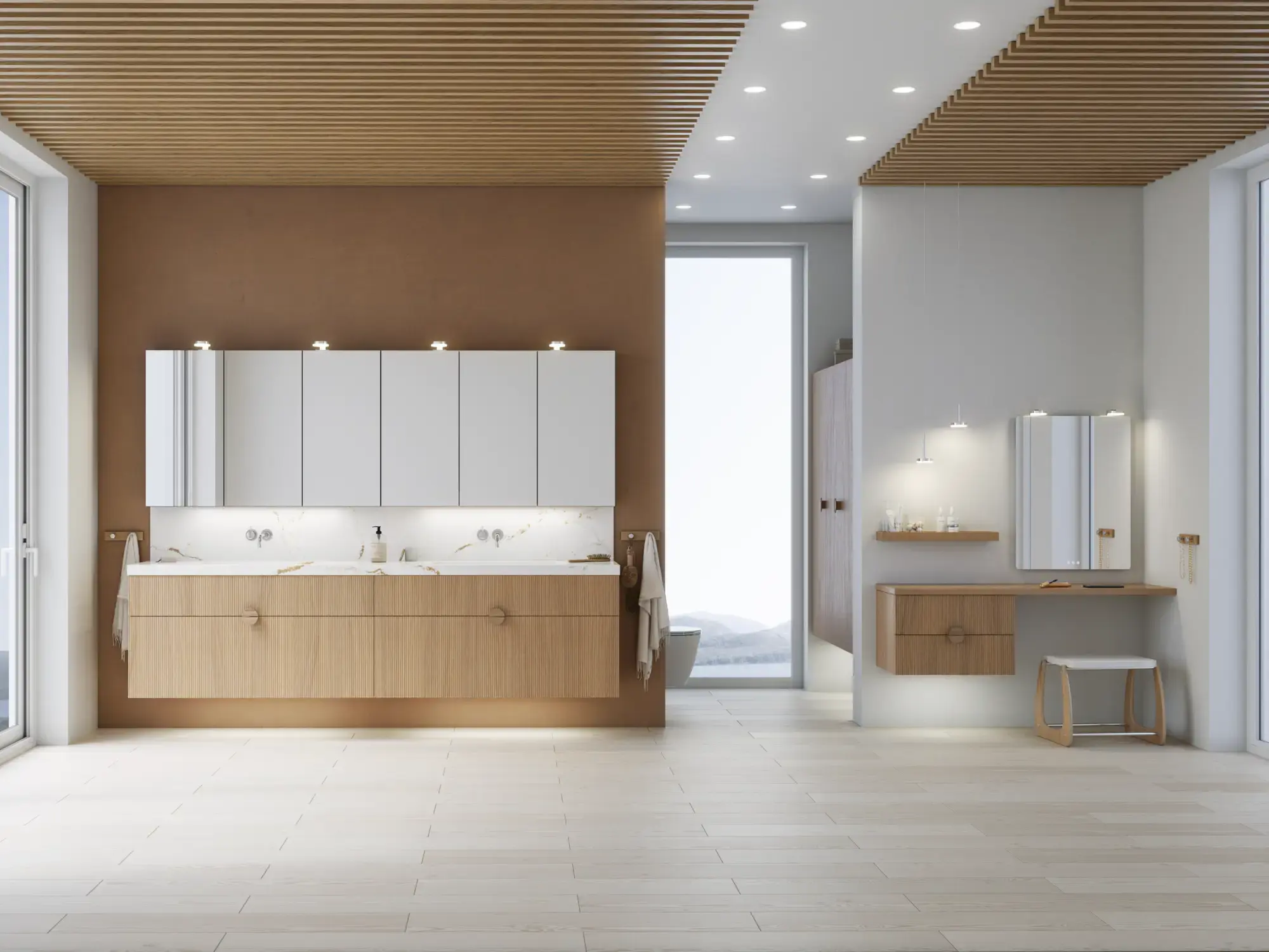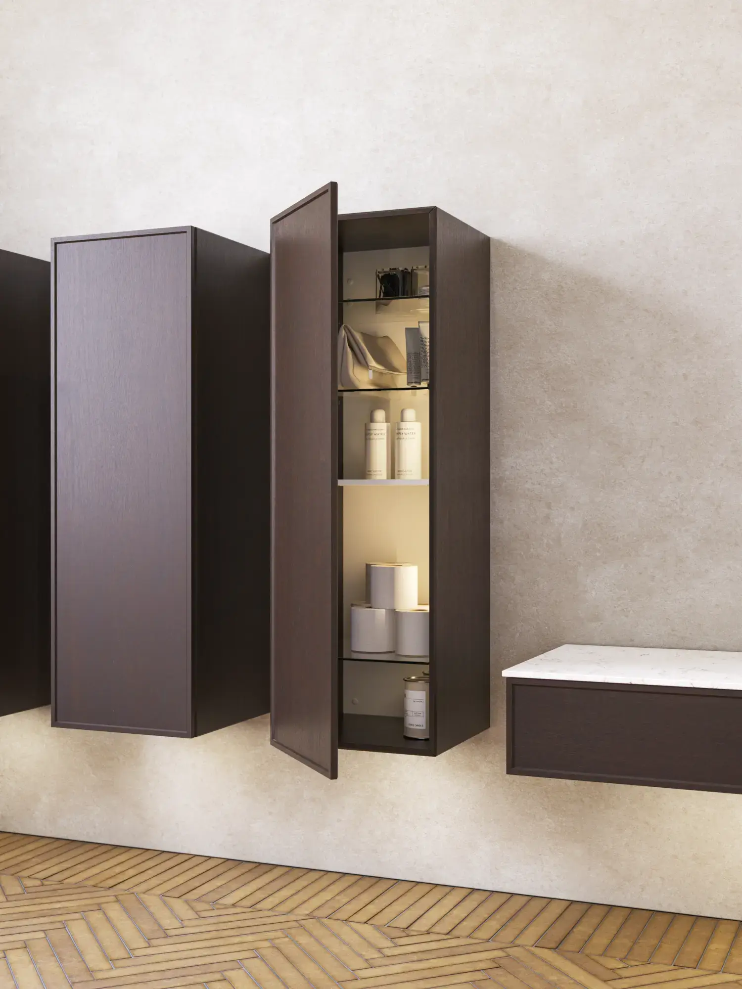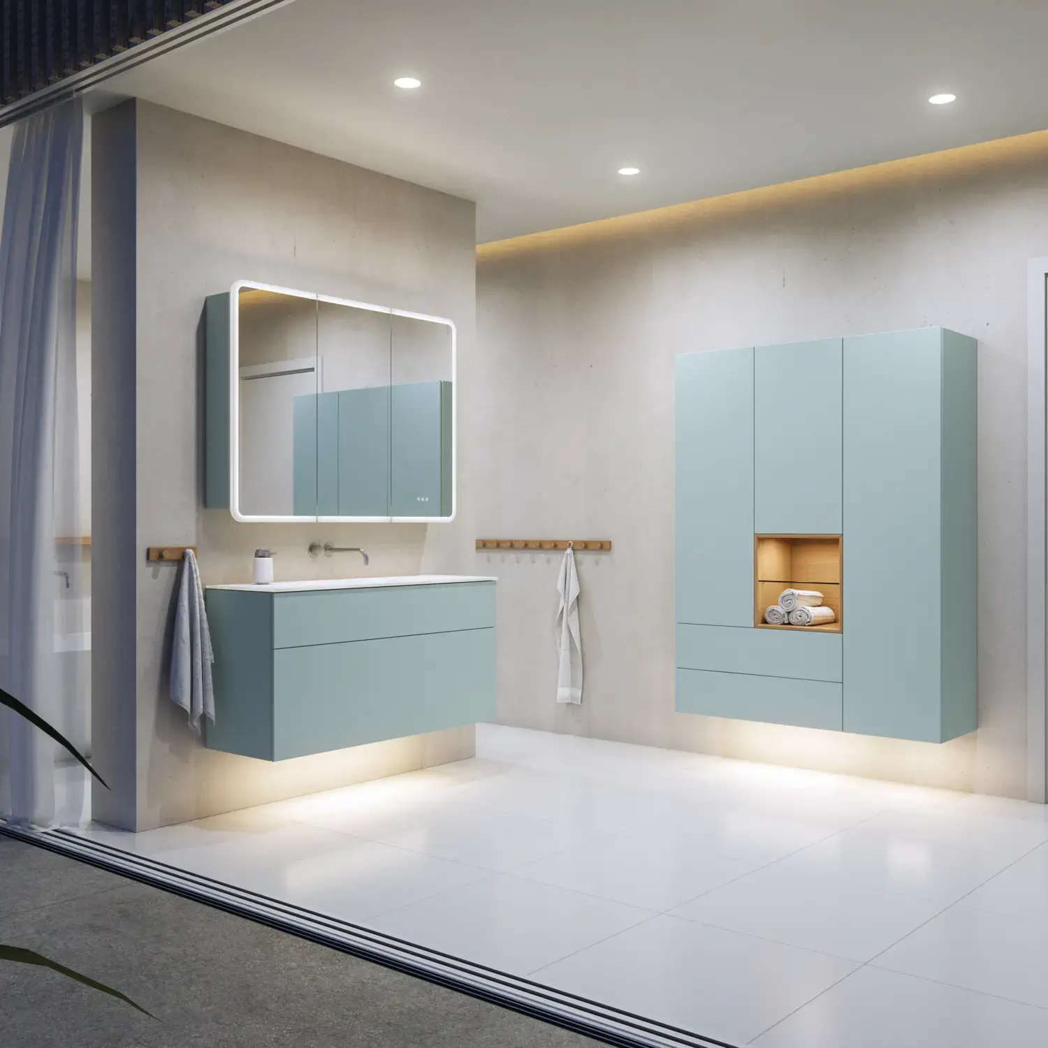 Wenn Ästhetik und Funktion miteinander verschmelzen, entsteht ein Raum in perfekter Balance. Mit Calidris können Sie das gesamte Badezimmer in einem durchgängigen Ausdruck gestalten – von den eleganten Spiegelschränken und offenen Regalen bis hin zu den schwebenden Hochschränken mit Licht darunter. Die klaren Linien, die taktilen Fronten und die durchdachten Details schaffen eine Atmosphäre von Ruhe und Exklusivität.