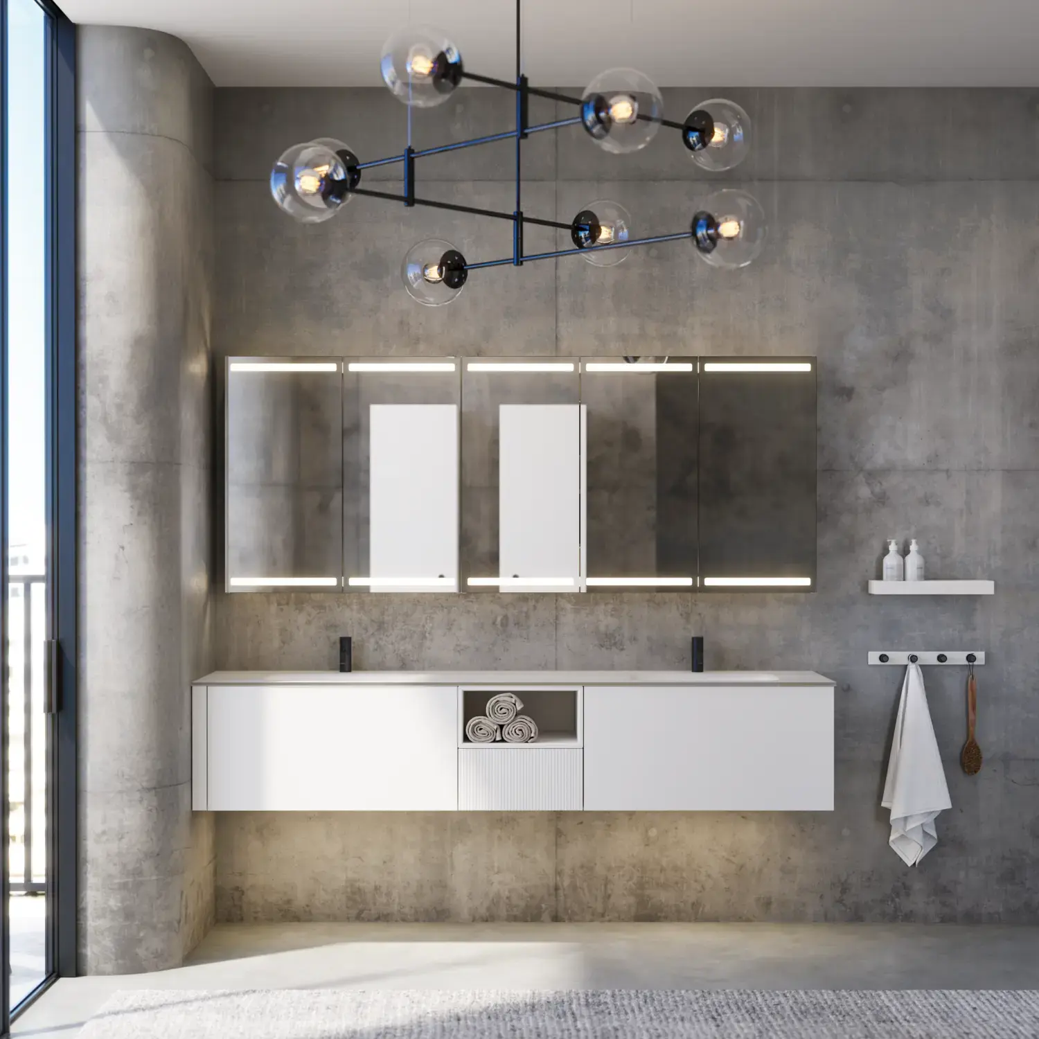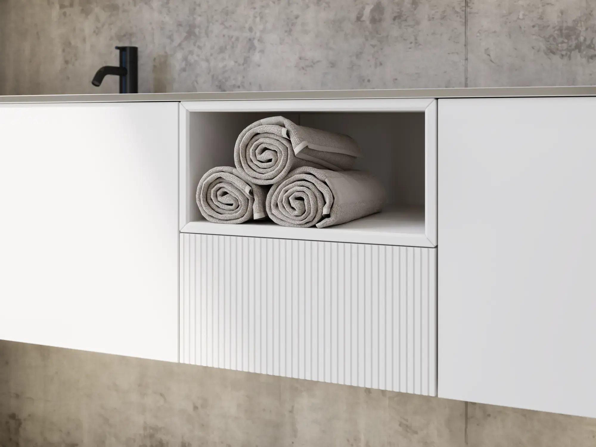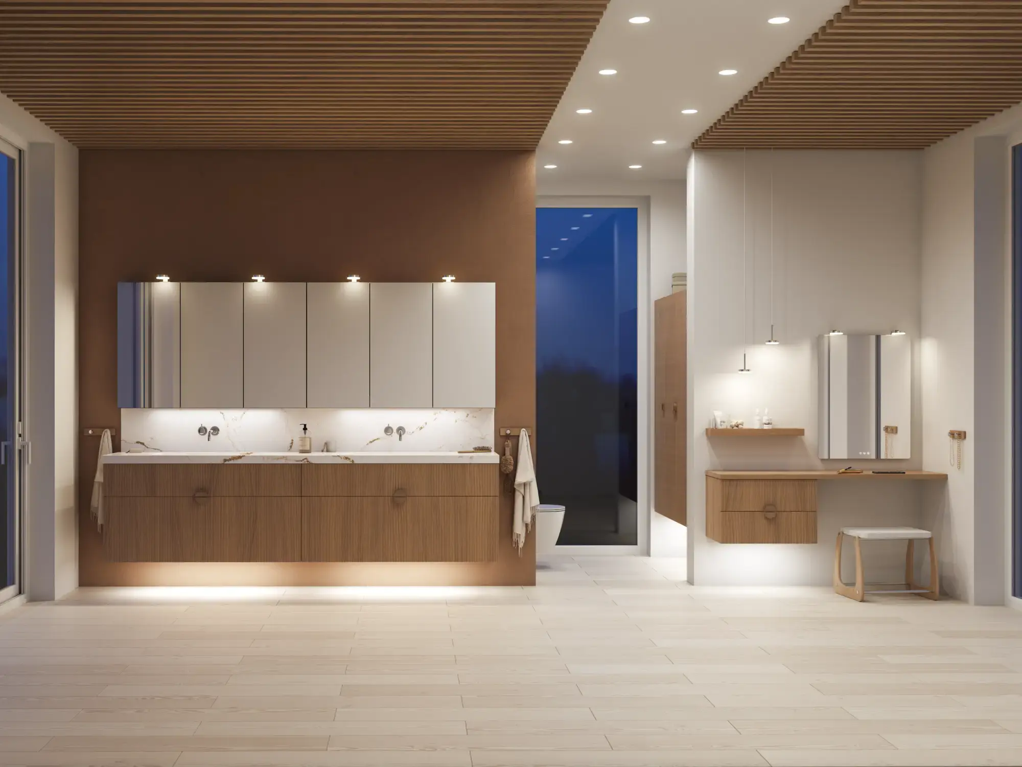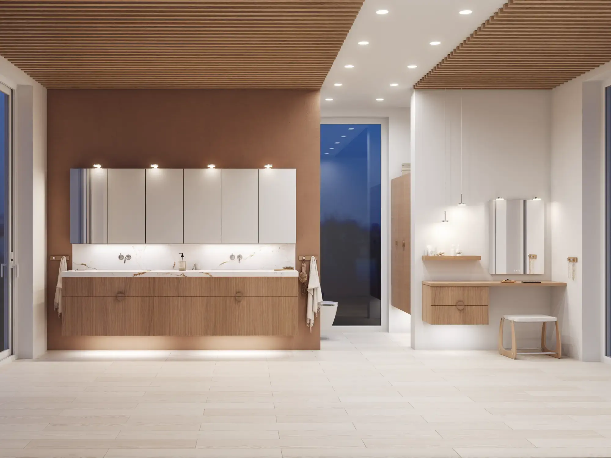 Wenn Ästhetik und Funktion miteinander verschmelzen, entsteht ein Raum in perfekter Balance. Mit Calidris können Sie das gesamte Badezimmer in einem durchgängigen Ausdruck gestalten – von den eleganten Spiegelschränken und offenen Regalen bis hin zu den schwebenden Hochschränken mit Licht darunter. Die klaren Linien, die taktilen Fronten und die durchdachten Details schaffen eine Atmosphäre von Ruhe und Exklusivität.