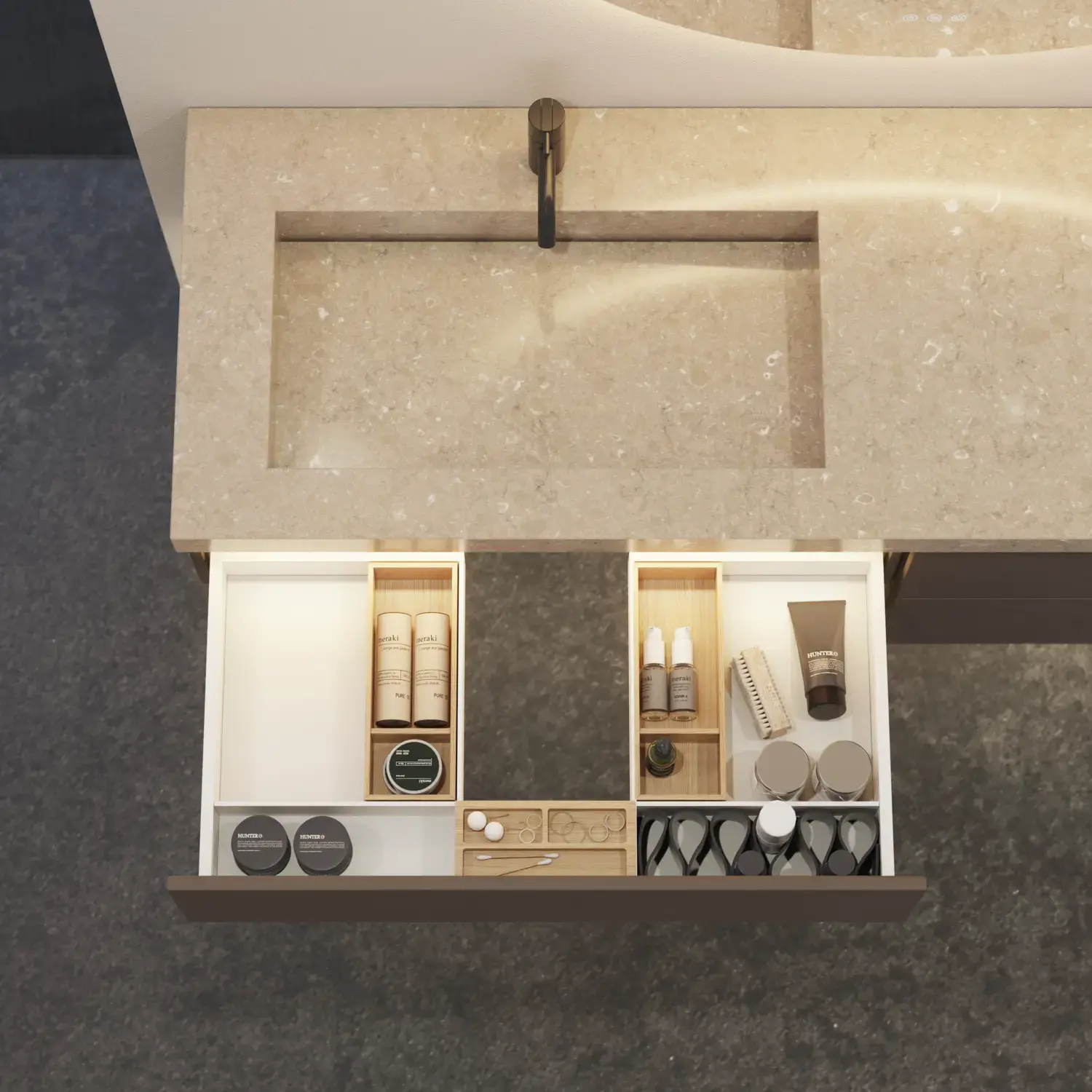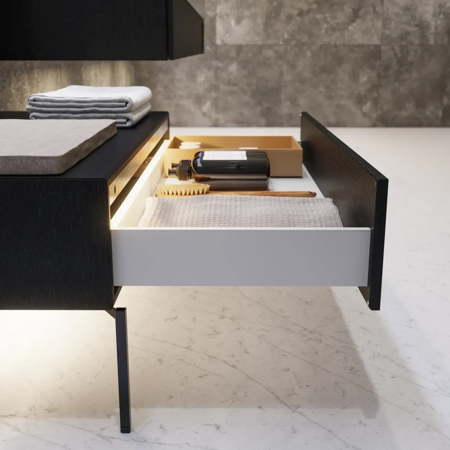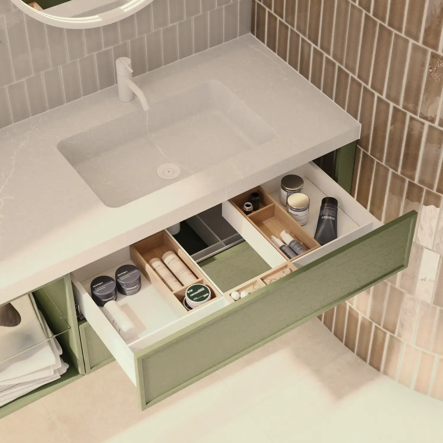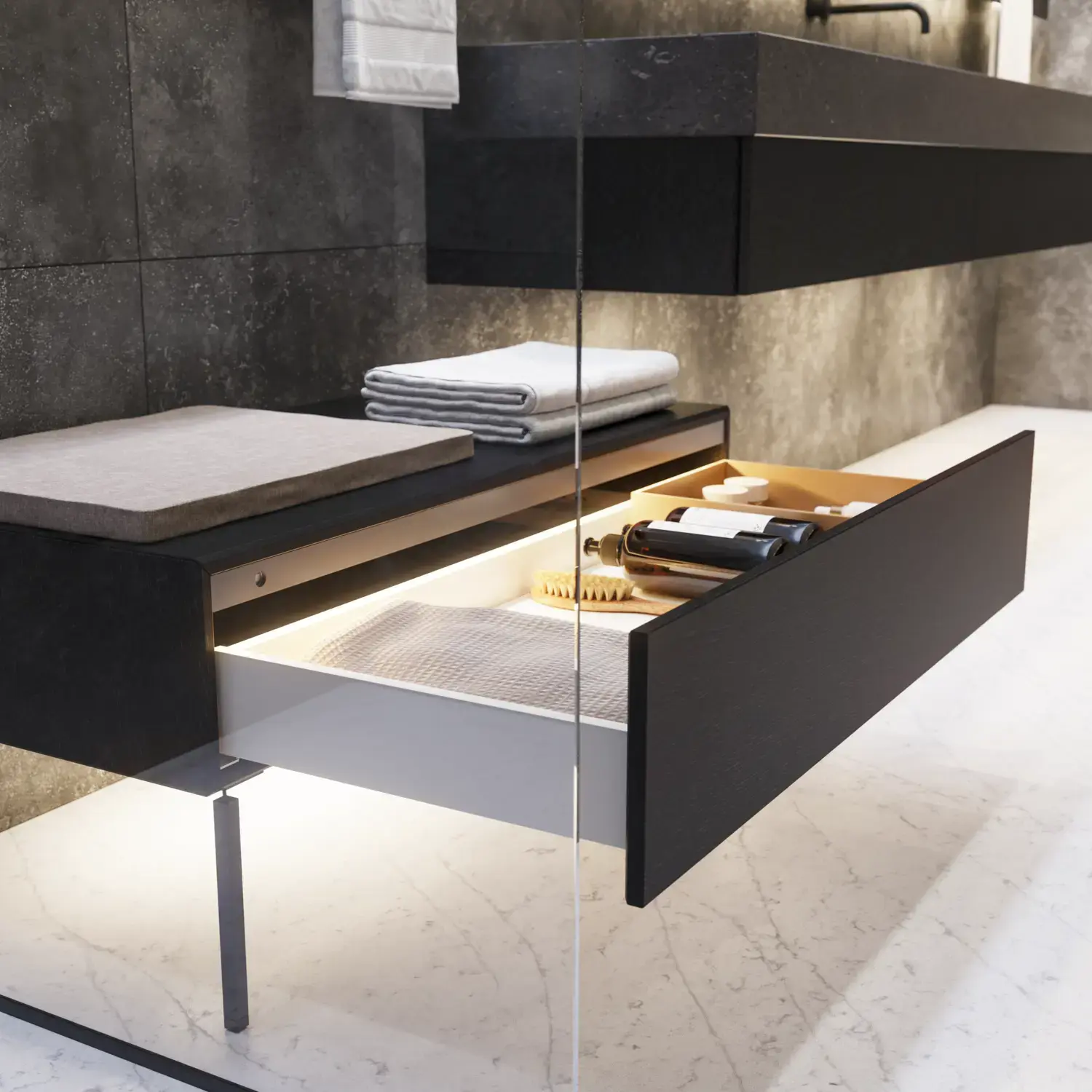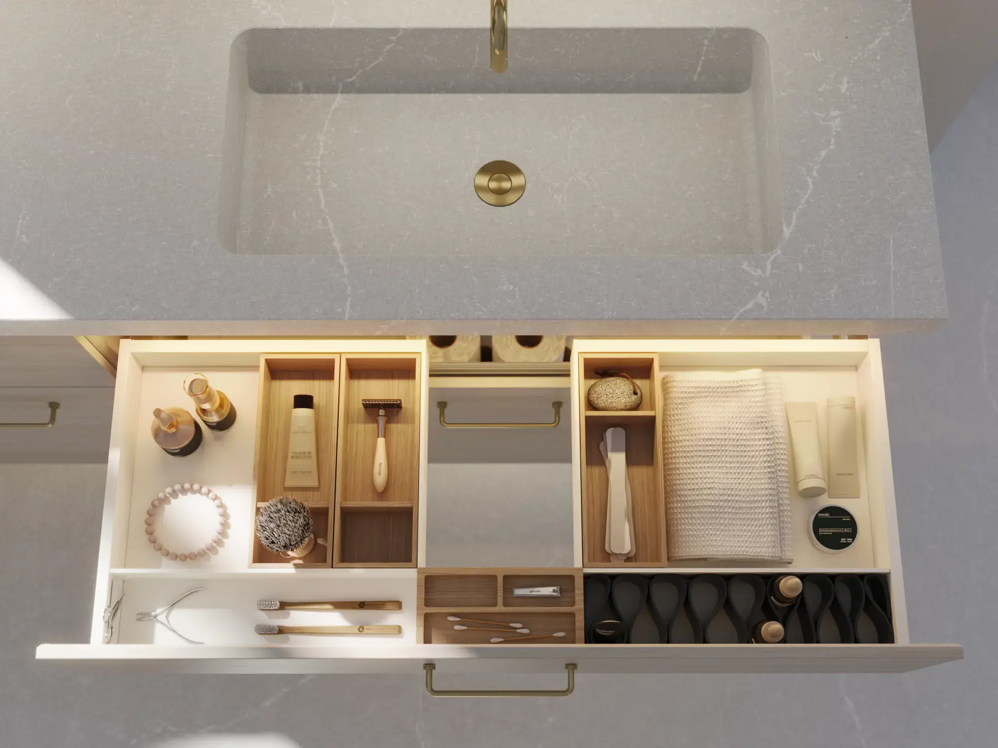 Schaffen Sie Ordnung in Ihren Schränken und Schubladen mit praktischem Zubehör, das Ihnen ein besseres Benutzererlebnis verschafft, und mit dem Ihr exklusives Badezimmer ganz einfach sauber und ansprechend bleibt.