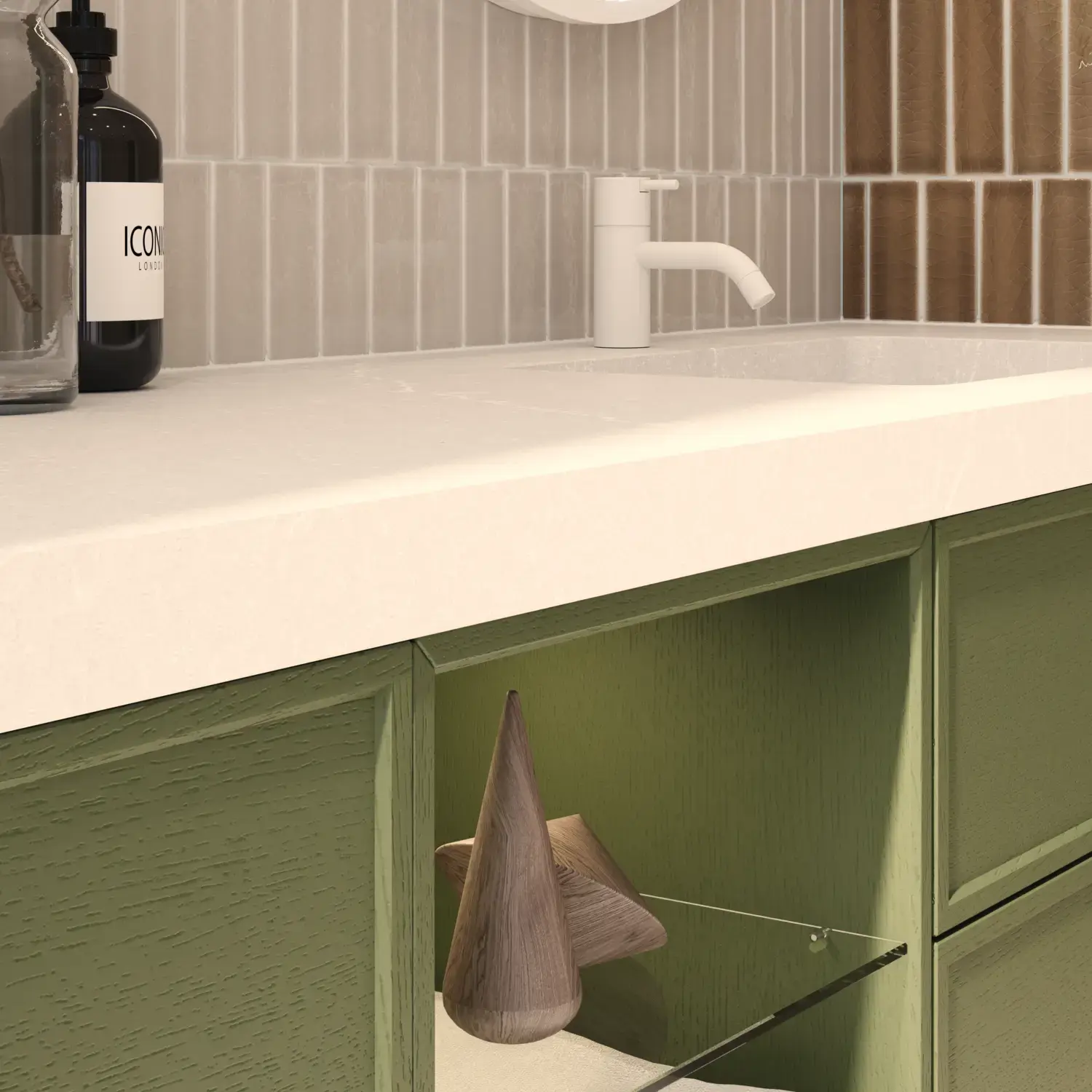 Mit Calidris können Sie zwischen 7 raffinierten Holznuancen und einem durchgefärbten Furnier wählen – alle mit der Möglichkeit für Rillen oder Rahmenfronten. Ein handwerklicher Ausdruck, der Ihrem Badezimmer Wärme, Charakter und zeitlose Eleganz verleiht.