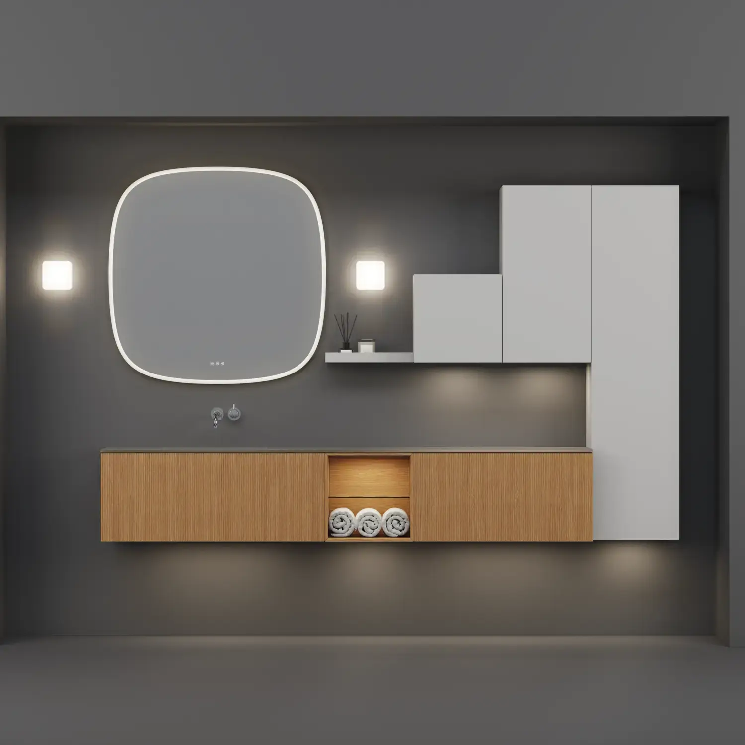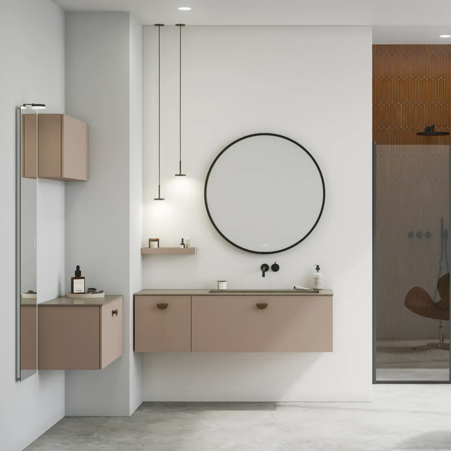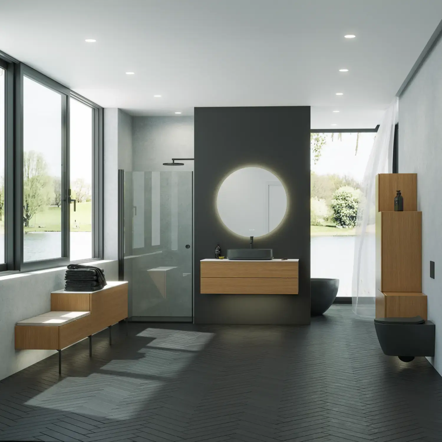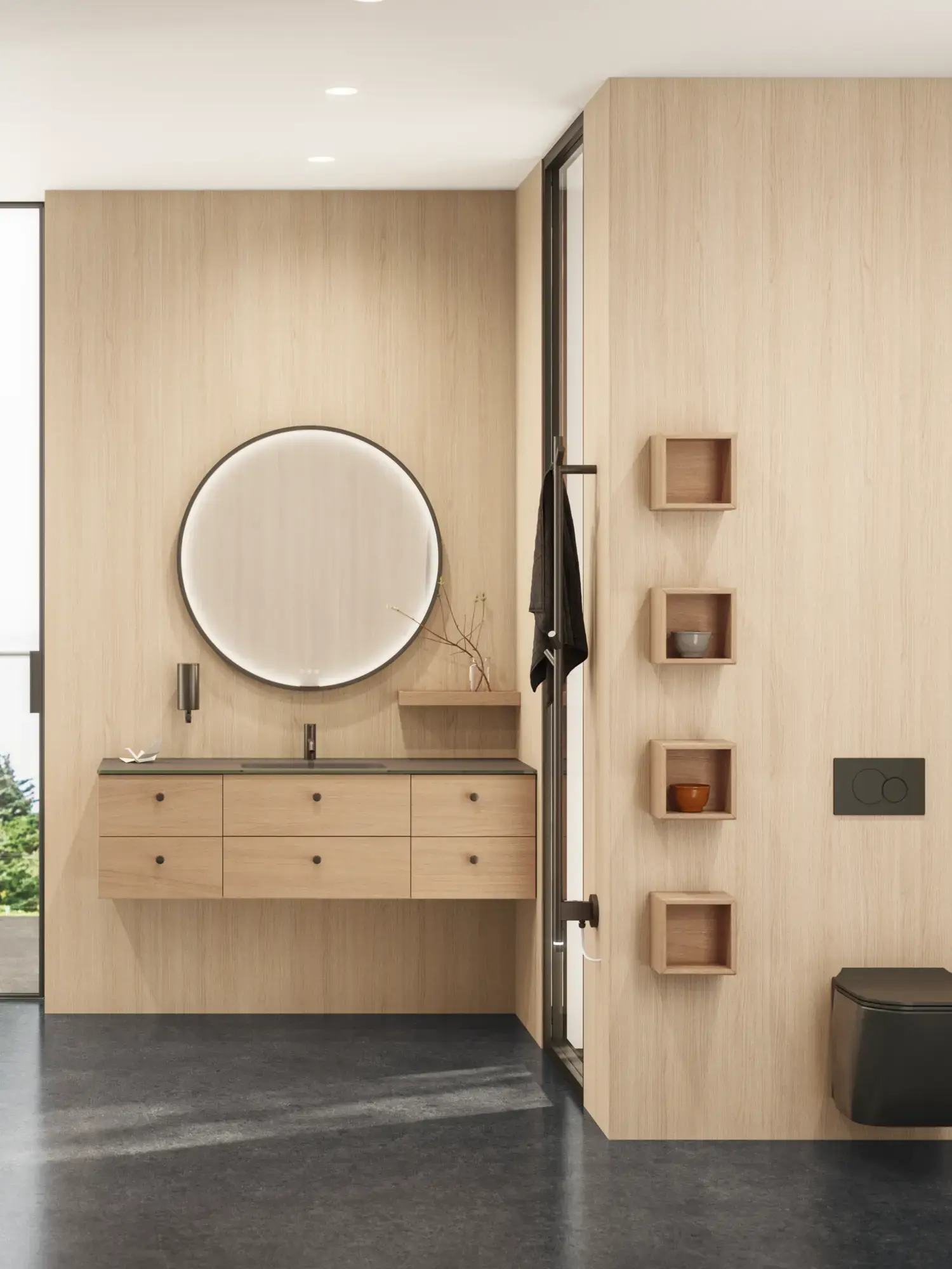 Die runden Formen des Moon-Spiegels und der neue, exklusive Demi-Griff aus Holz verleihen dem Badezimmer eine ruhige Balance und einen Hauch von Wärme.