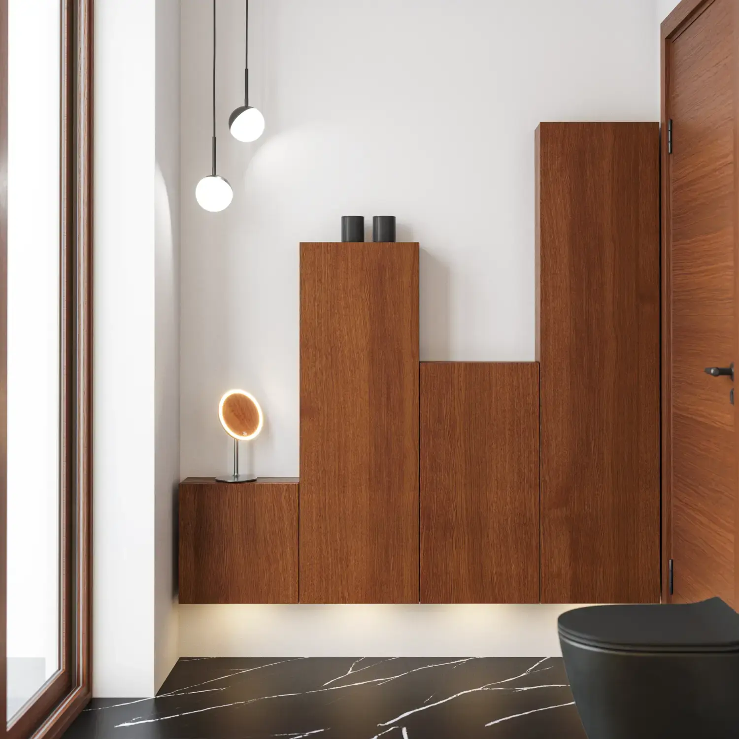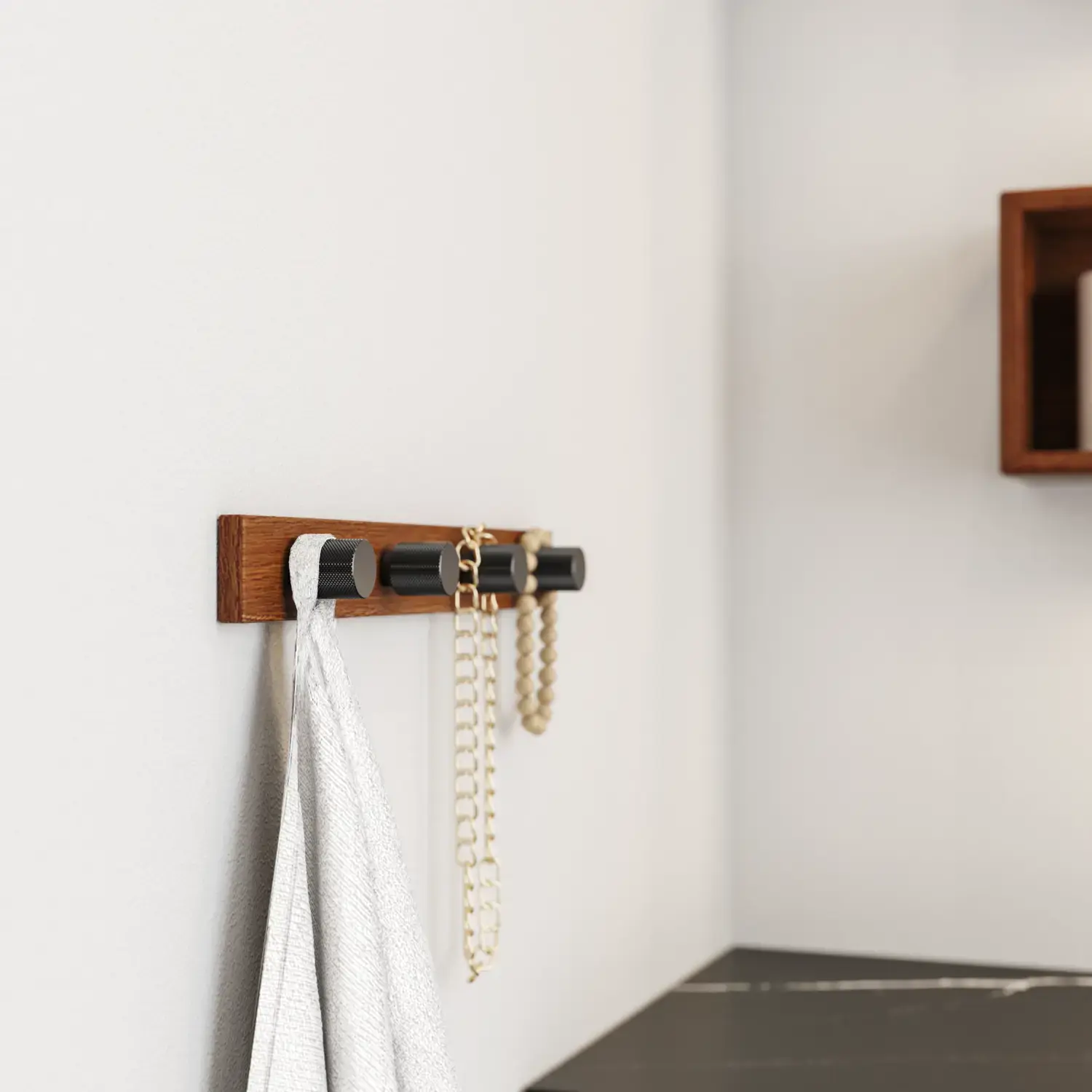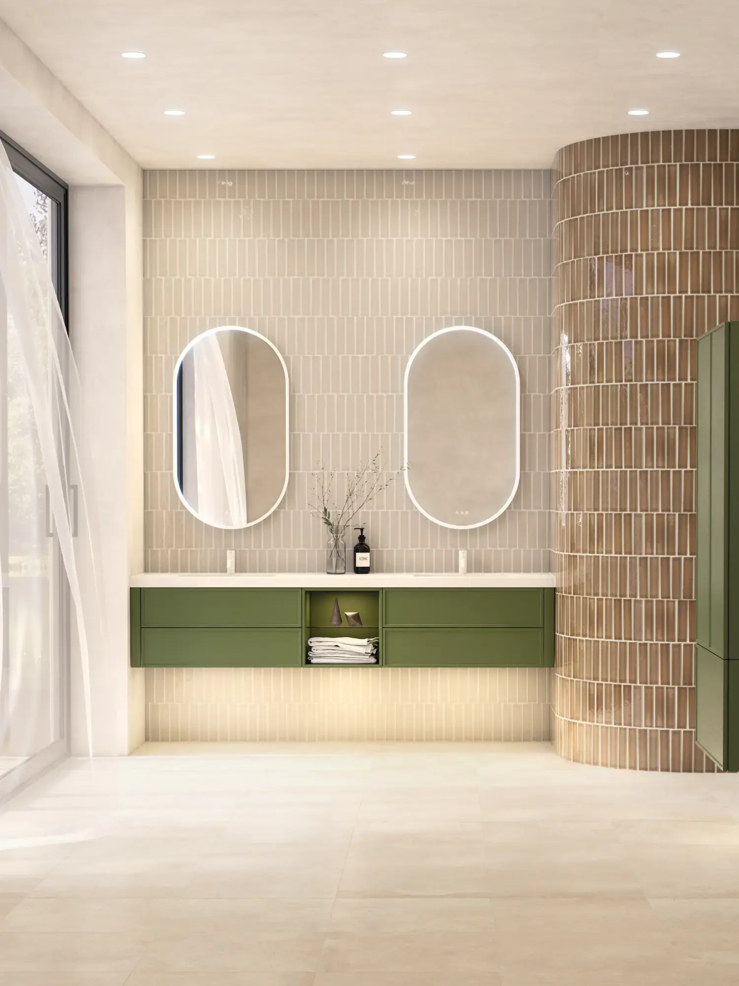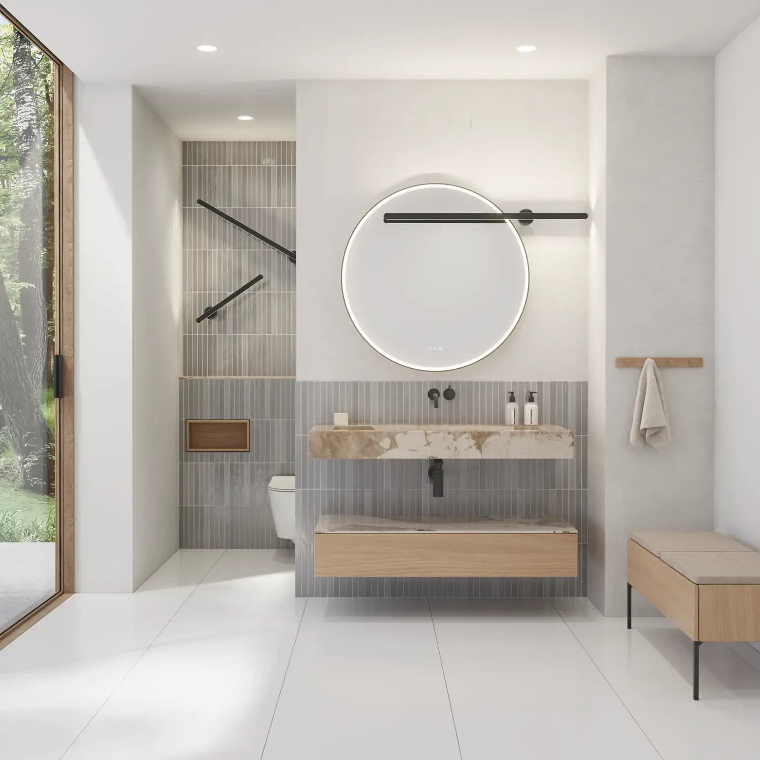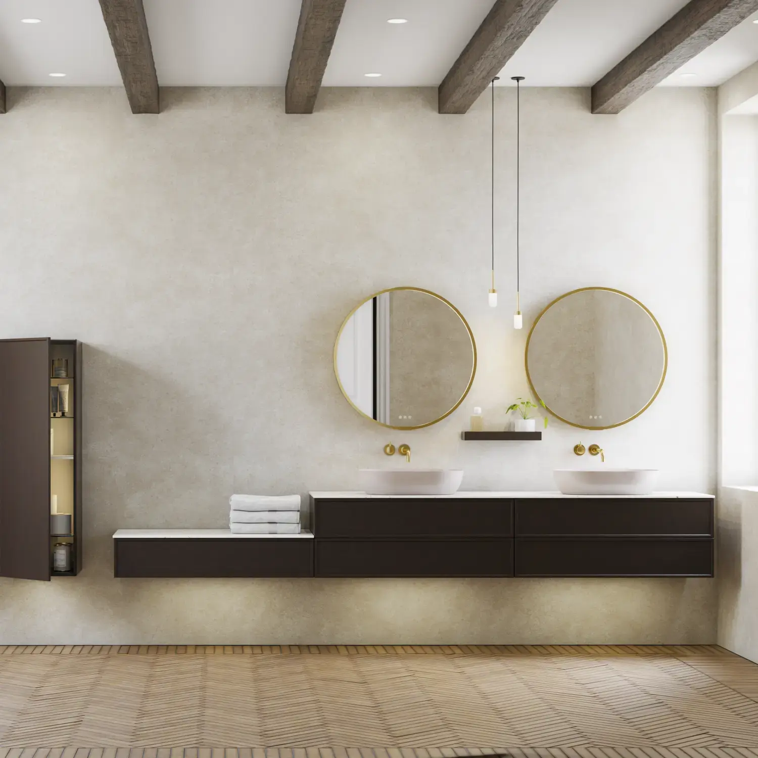Die runden Formen des Moon-Spiegels und der neue, exklusive Demi-Griff aus Holz verleihen dem Badezimmer eine ruhige Balance und einen Hauch von Wärme.