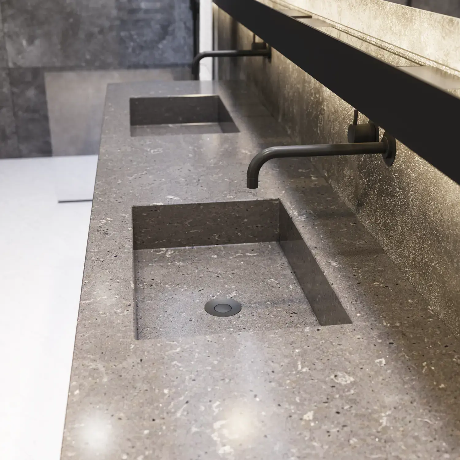 Eine schöne Lösung mit maßgefertigten Waschtischen und Tischplatte aus dem fantastischen Silestone®. Materialien der Natur zu einer eleganten und einzigartigen Einheit vereint, die in jeder Hinsicht Luxus und Wohlbefinden ausstrahlt.
