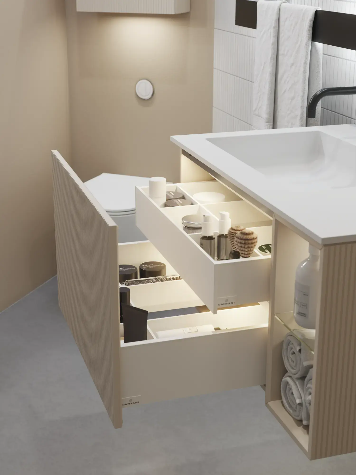 Das Zubehörprogramm der Serie Dansani Calidris beeindruckt ebenso, wie die Möbel selbst. Alles passt perfekt zusammen. Ton in Ton mit den Möbeln oder als kreative Kontraste.