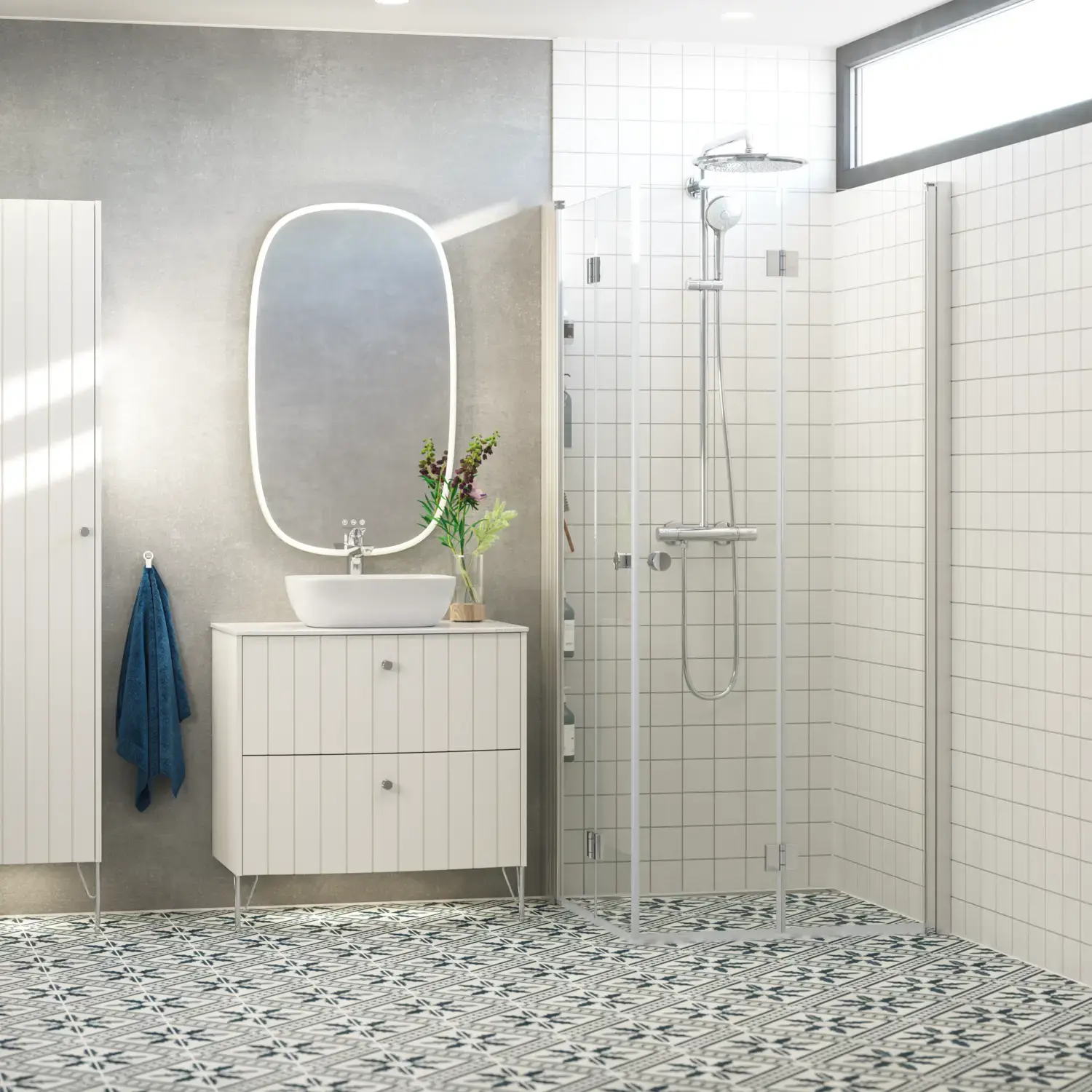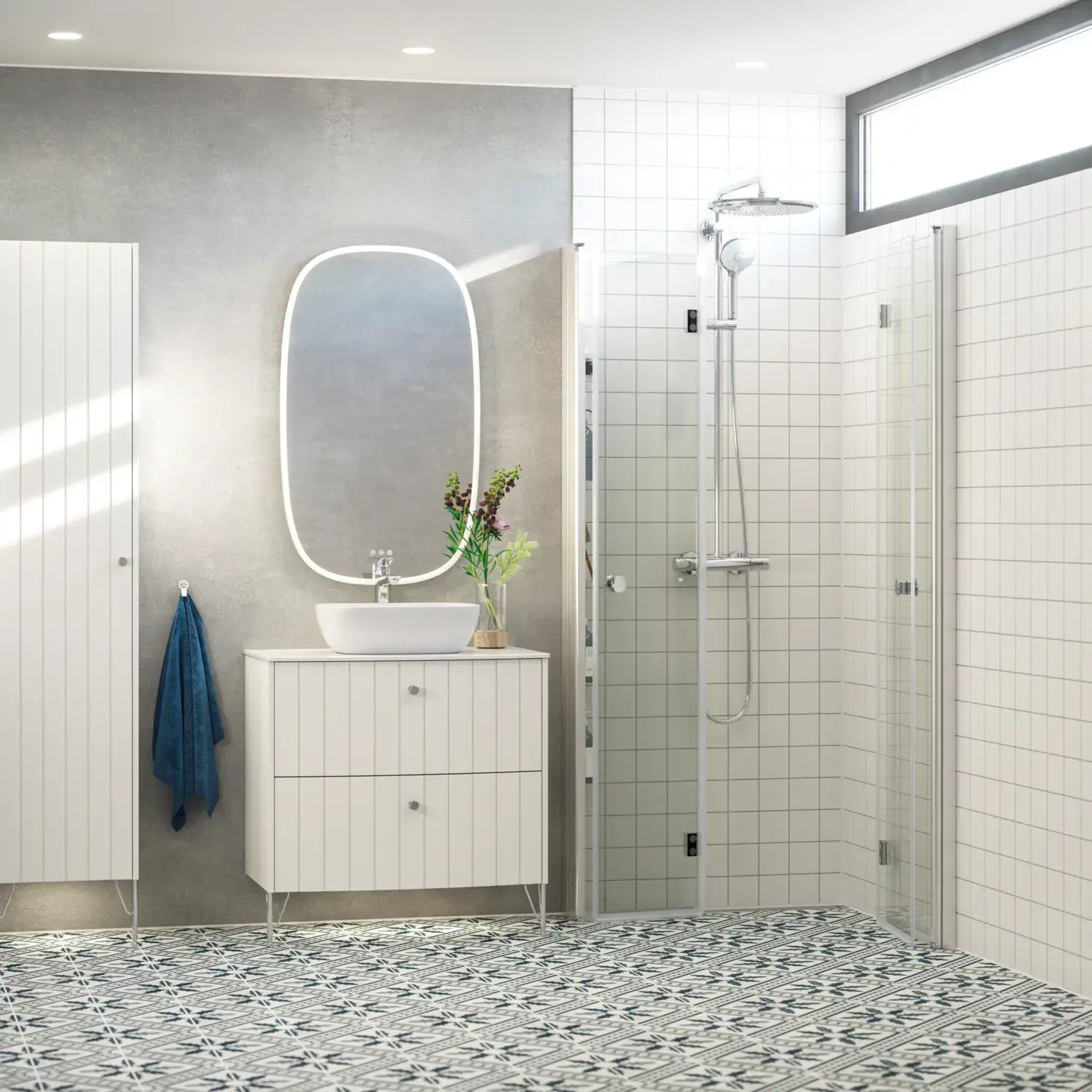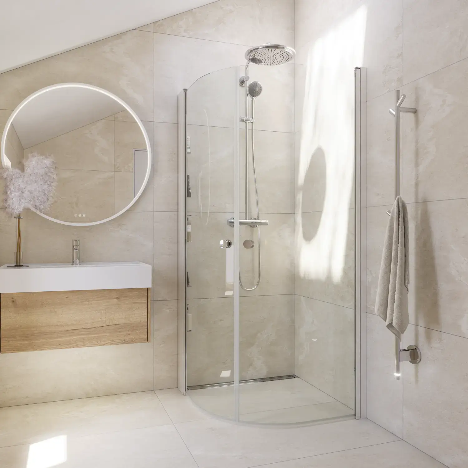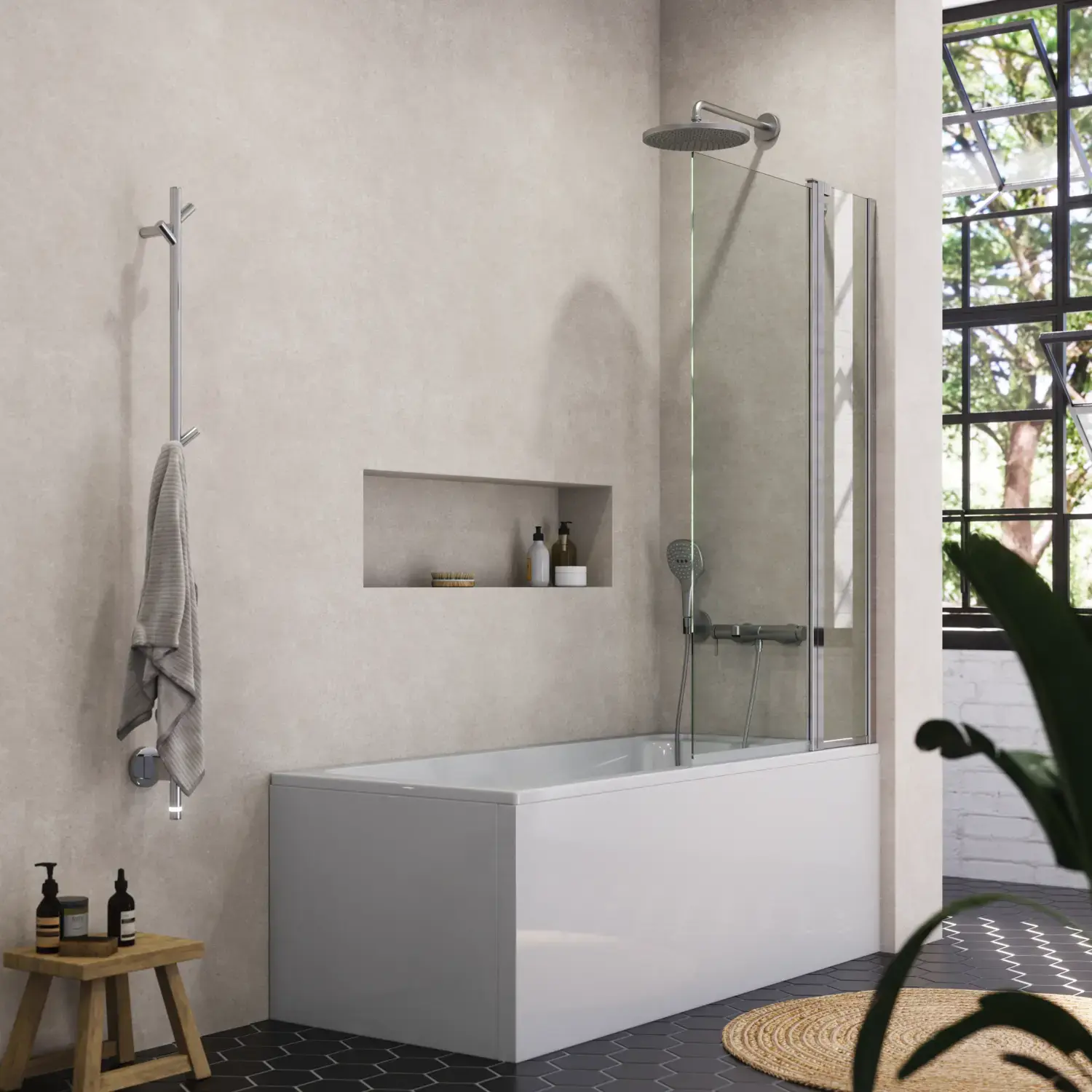 Tauschen Sie Ihren Duschvorhang durch eine elegante Duschabtrennung aus, die Ihnen das Gefühl von mehr Raum vermittelt. Die Glastüren lassen sich vor die Armatur drehen, so dass sie so wenig Platz als möglich einnimmt. Der Stabilisierungsarm wird mitgeliefert.