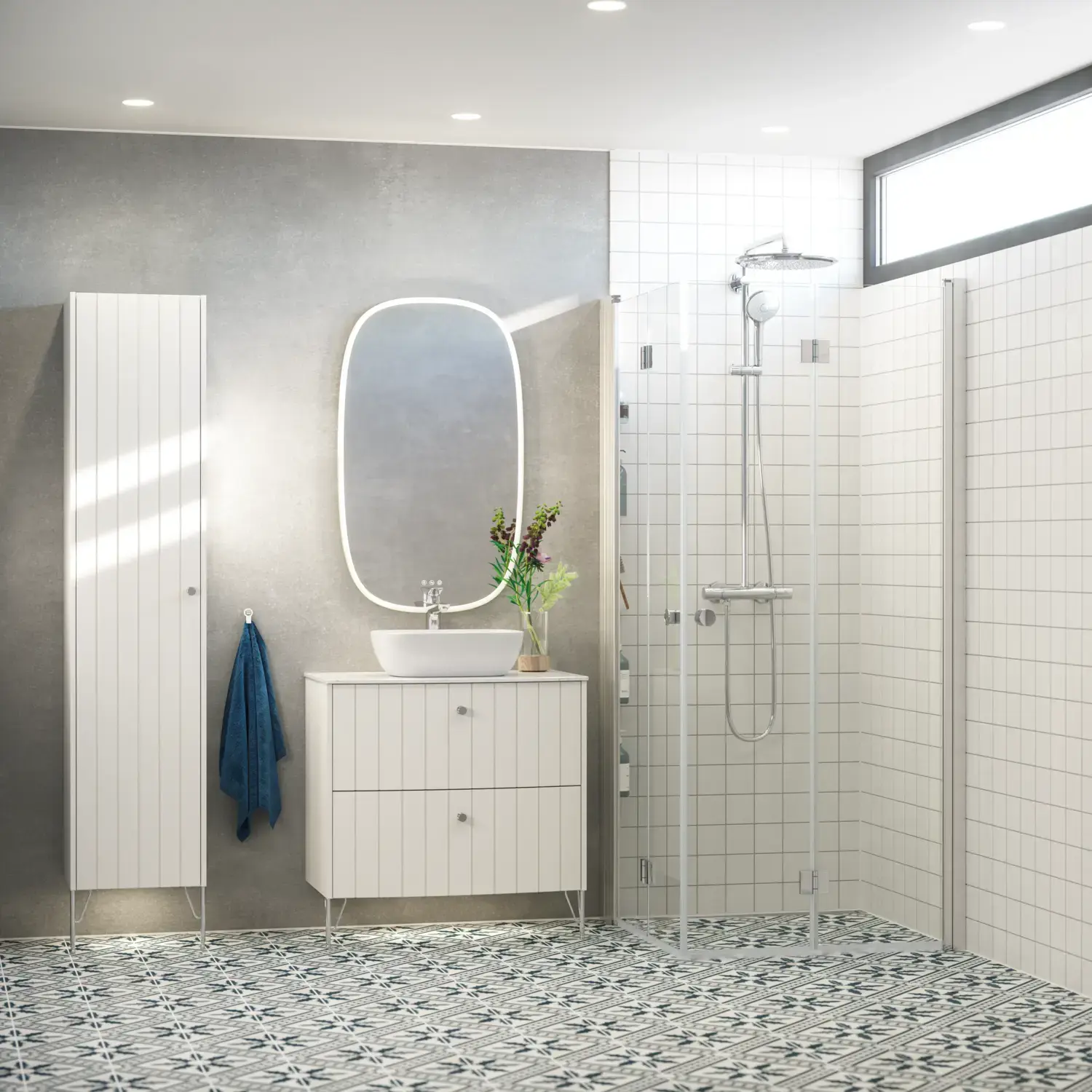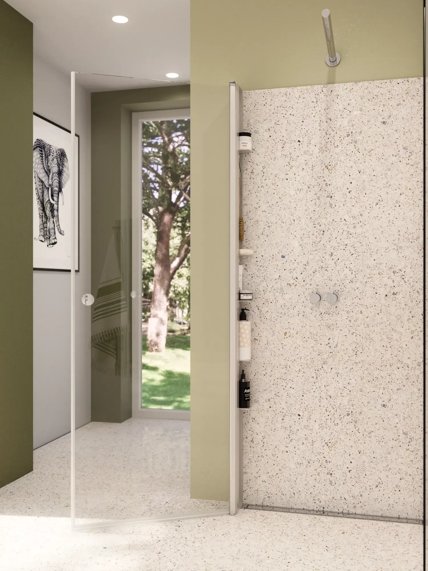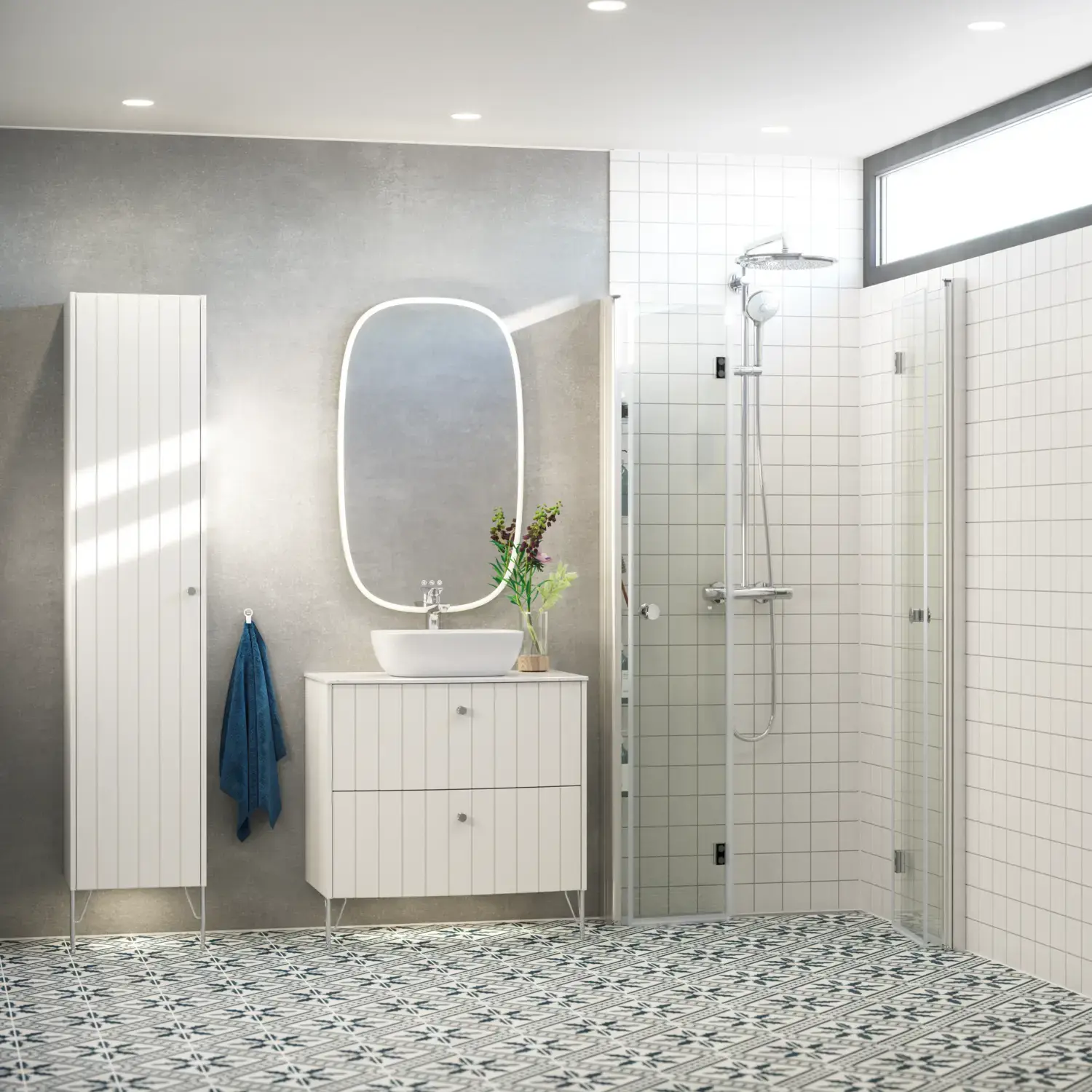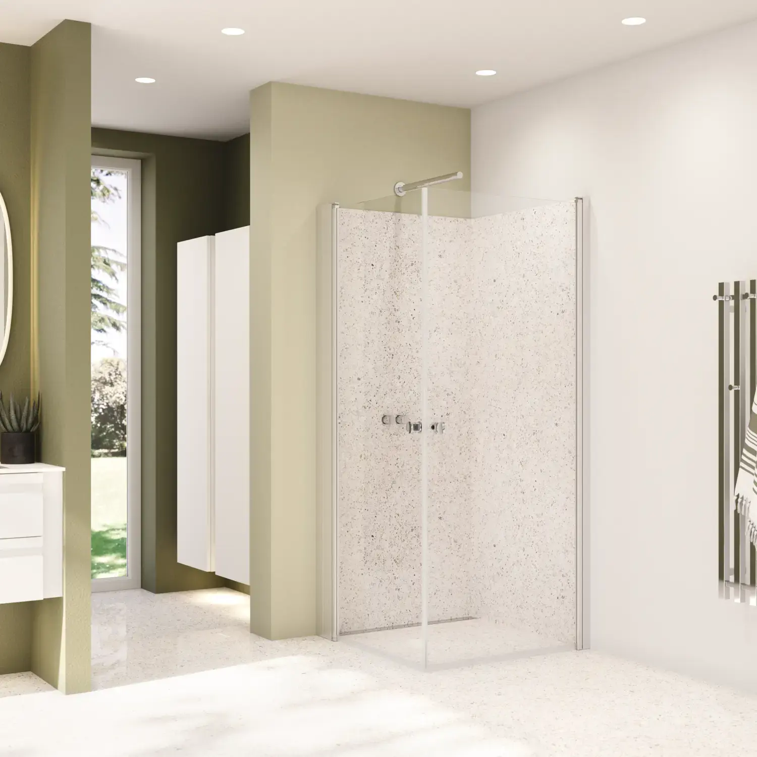 Tauschen Sie Ihren Duschvorhang durch eine elegante Duschabtrennung aus, die Ihnen das Gefühl von mehr Raum vermittelt. Die Glastüren lassen sich vor die Armatur drehen, so dass sie so wenig Platz als möglich einnimmt. Der Stabilisierungsarm wird mitgeliefert.