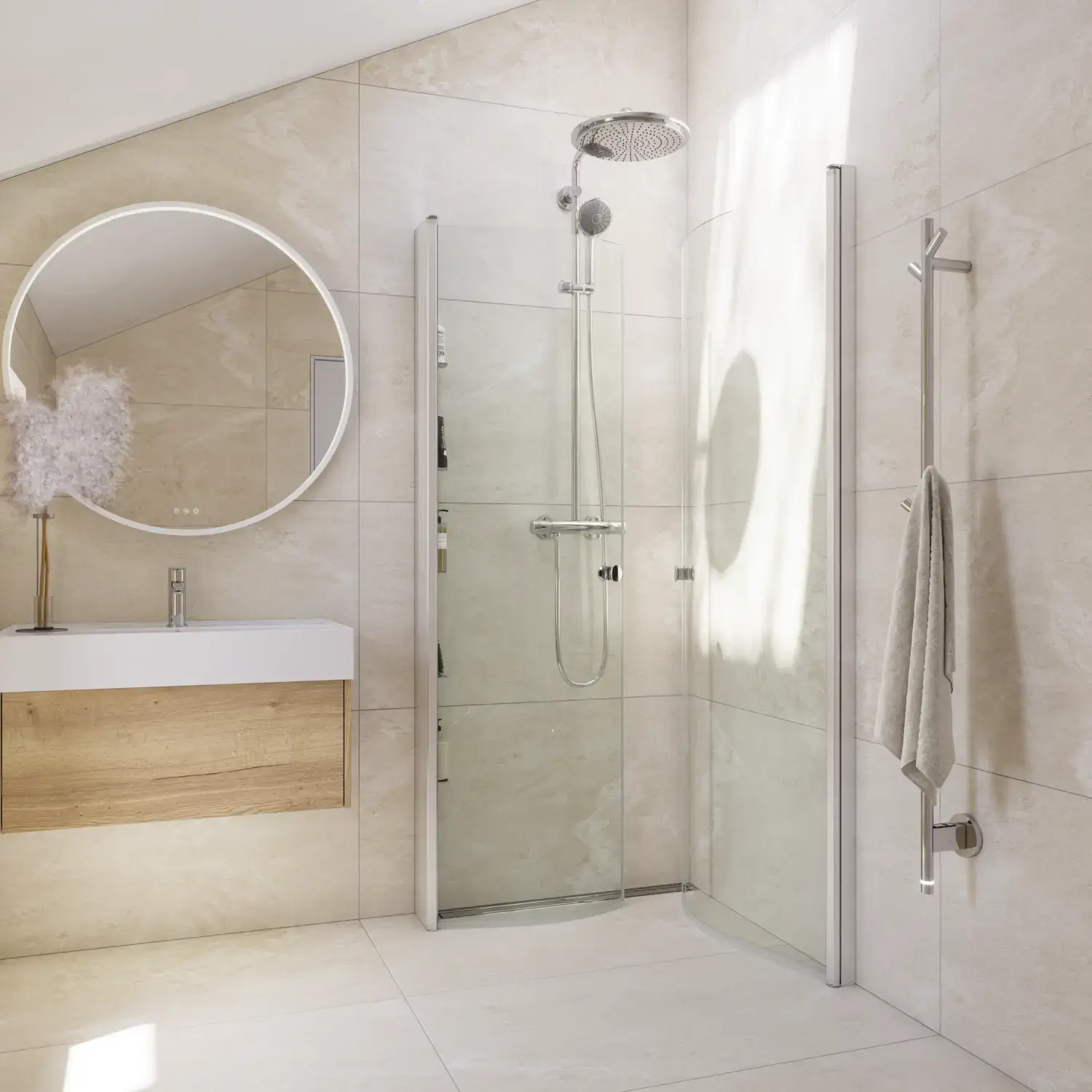 Zwei gebogene Duschtüren von Dansani Match können zu einer Duschecke zusammengesetzt werden. Türöffnung nach innen und nach außen schafft wertvollen Platz, wenn die Dusche nicht benutzt wird.