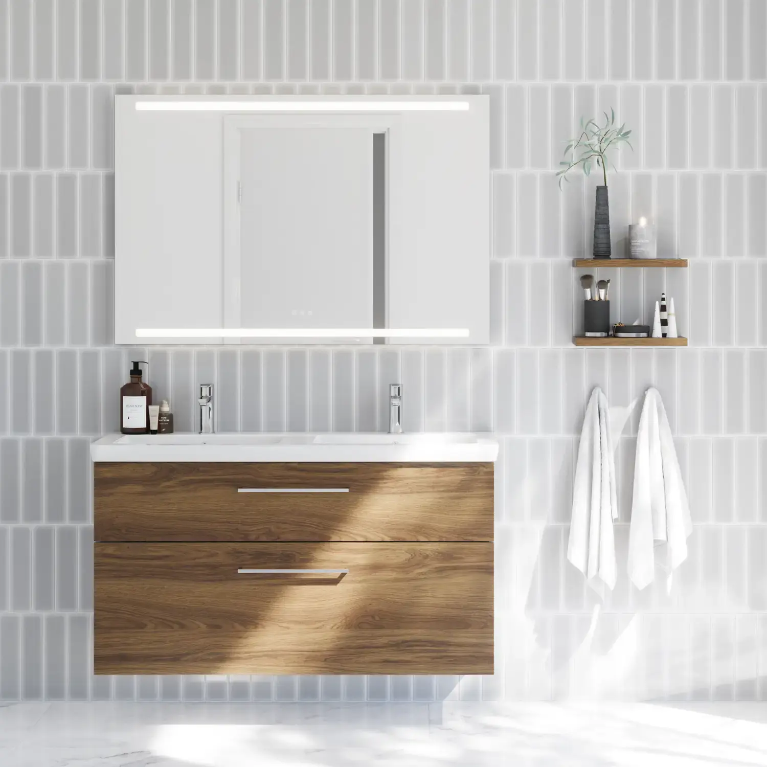 Haben Sie ein Doppelwaschbecken? Dann ist ein 120-cm-Spiegel die ideale Wahl. Er sorgt dafür, dass beide Waschbecken eine optimale Spiegelfläche haben, während der Spiegel das gesamte Möbelstück auf harmonische Weise zusammenhält. Ein großer Spiegel sorgt außerdem für mehr Ruhe im Bad als zwei kleinere Spiegel. Die große Spiegelfläche beruhigt das Auge und lässt das Bad harmonischer erscheinen.
