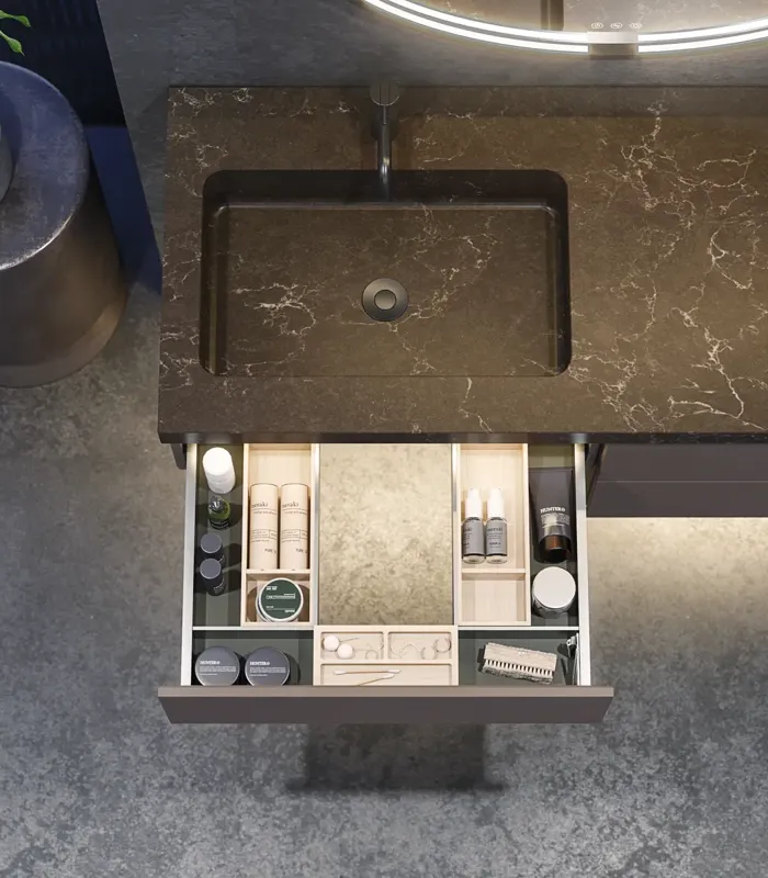 Dekton® ist extrem robust und in der Trilium-Variante eine CO2-neutrale Option, die mit Strom aus 100% erneuerbaren Energiequellen hergestellt wird und bis zu 80 % recyceltes Material enthält. Dekton® ist hitzebeständig, schlagfest, kratzfest und äußerst pflegeleicht. Sie können handelsübliche Badreiniger verwenden.